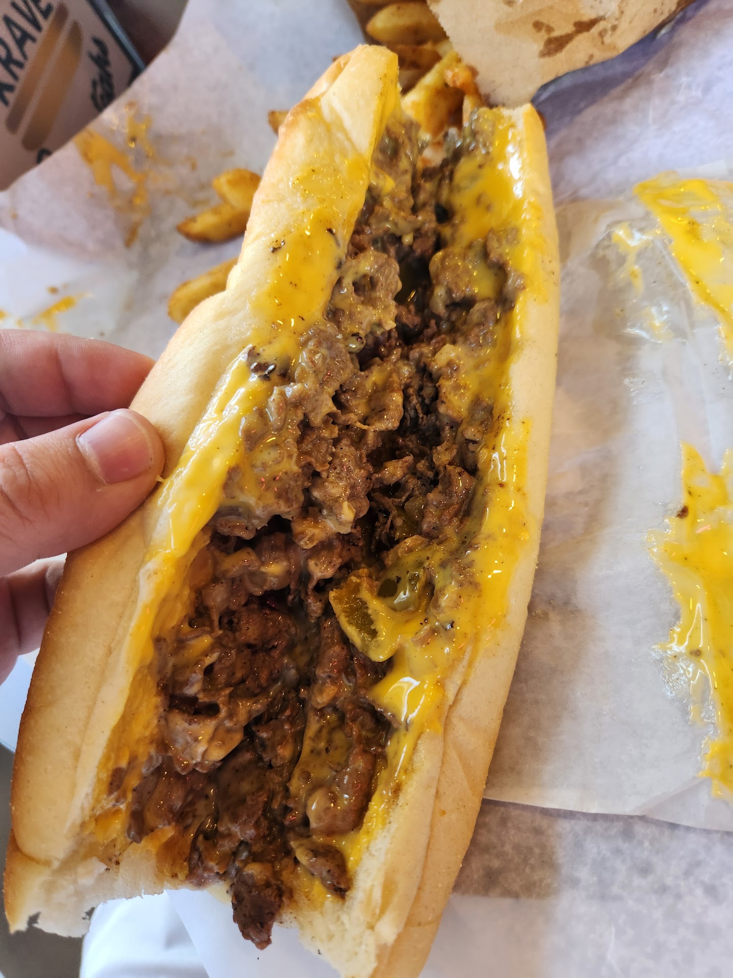 Read moreSo here’s my 2 cents worth… Used to live in Phila and have had steaks from like all the shops that existed between 2008-2009, so that’s my frame of reference. Food: ordered a standard - cheese wit’. IMO, not Phila-level good. Bread’s just too soft, I’m doubting rib eye from the look and feel of the chop and the whiz (only offer that or American) was not melted enough, SEEMINGLY added at the end but I didn’t see the prep process cuz it was packed to the gills in there. Service: leaning 3 but gave 4 stars bc the staff are cordial and professional, as they should be. But the wait time for a steak is a bit long. Atmosphere: nice looking spot with potential. With some imagination, I can see some more seating and a standing ledge added, but as of now just 2 two toppers in here. There’s music playing and a tv...