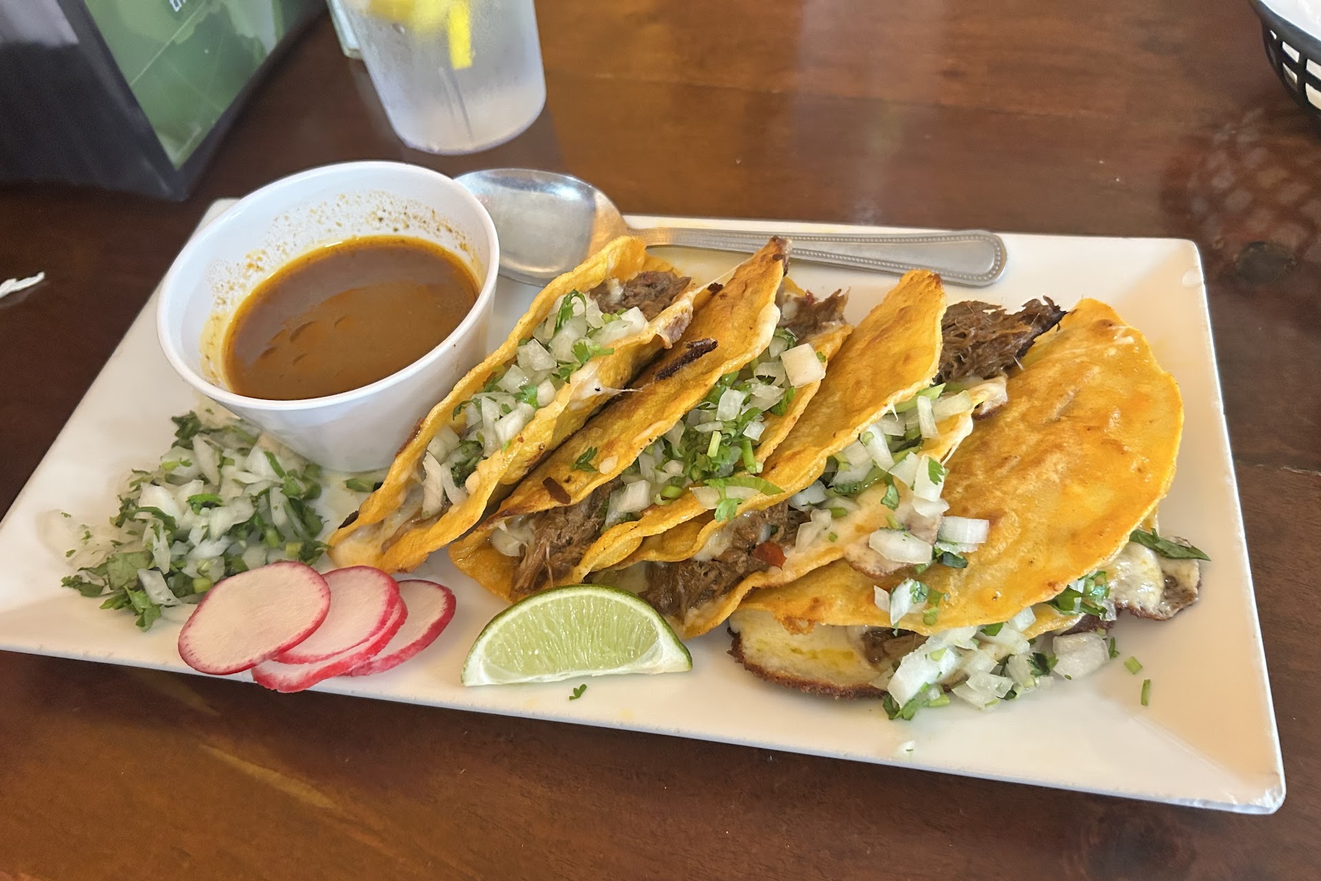 Tacos de Birria: The Tacos de Birria at Mr. Taco are undeniably some of the best we've ever tasted. The tortillas were perfectly crispy yet soaked just right in the savory birria juices. Each taco was generously filled with tender, flavorful shredded beef, and topped with onions, cilantro, and a squeeze of lime for a burst of freshness. These tacos are truly award-winning and a must-try.