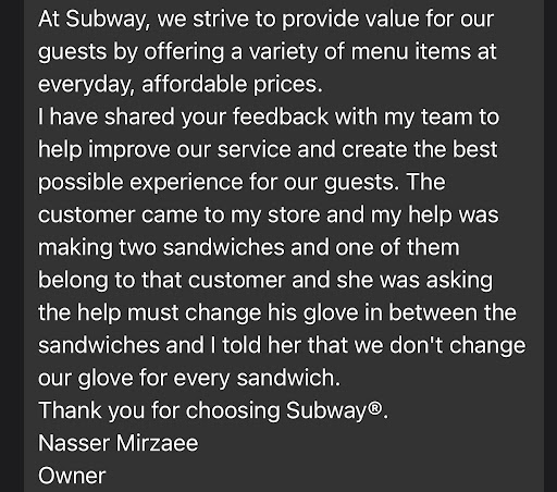 Long story short, many items on the sandwich were wrong. All the while they’re juggling 5 different orders at once. I thought pick up takes priority? Guess not. When I reached out to customer service, they were of no help of course. What the did was pass on my info to the rude store owner who was mocking me on the way out. Below is his response to me. In the email he confirmed what he told me in store when I asked about glove changing, cause between you and I, I don’t want what the guy in front of me is having!