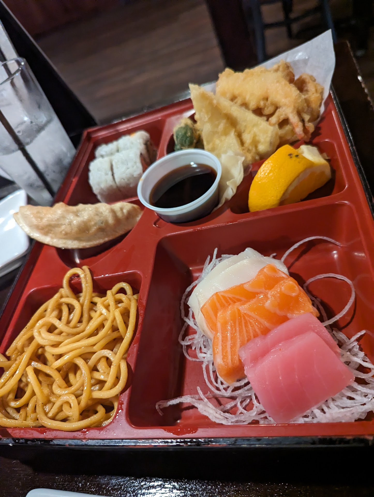 The cheap salad they serve before entrees come out was gross. Tasteless iceburg lettuce and ginger dressing. That's it. The dressing has changed since last visit. My husband said it's more sweet and less ginger flavor. I could not eat it, because it contains milk.