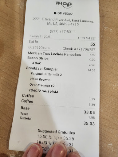 Ihop your bacon game needs work Flimsy bacon for the price $5 for whimpy bacon? Which makes this taste extra greasy, instead of more like bacon. It's a breakfast minded You should have the best bacon, just saying I have family members that will pick restaurants based on their bacon lol I'm sure I'm not the only one. The Tres Leches pancakes are my favorite and Super super delicious! The sauces on those I'd buy at the store. I do wish you had like mini breakfast combos at price points. Like 2 theme pancakes, 2 pieces of choice meat, coffee at $. I do wanna say is why do you have old kramer on your menu and you do not carry it?? The the server explained that you guys do not move it fast enough. I understand that but We probably don't know you have it. Most people don't even look at the beverage section, they'll ask the server I was one for a long time. That being said , you should advertise that you have old creamer way more than the fine print s of the beverage section. I feel like this a missed opportunity. Restaurants are way behind. The US food allergies are on the rise. Lactose intolerance, dairy allergies And most corporate breakfast don't carry dairy free options like oat creamer. So advertised your oat creamer as a hook. Everybody. Knows you guys have pancakes and they're great. I don't think any of us knew that you had oat creamer. This may seem like a dumb thing to mention but 81% of people order coffee with breakfast If you can't have your Creamer with your coffee, Are you gonna order it? Probably not If you go out to breakfast and you know a restaurant carries dairy free creamer, Will you go there instead of somewhere that doesn't? I'm just saying missed opportunity and get your oat...