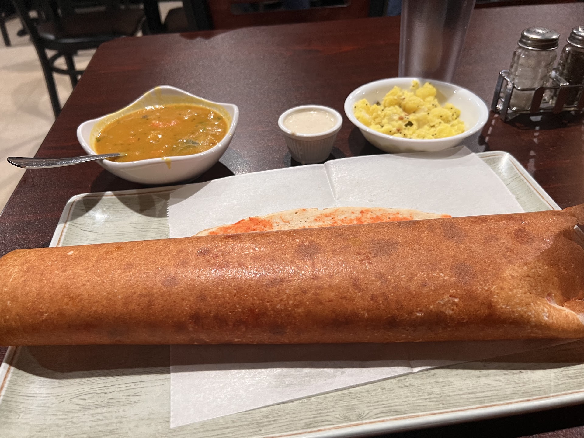 Big talk for a small restaurant. Good intentions, bad food. The mirch from the salan and panner from the butter masala decided to walk out! Having heard of a new Indian restaurant in town, I decided to give it a try. Hoping for a breath of fresh air to welcome another Indian restaurant we went there for dinner on 3/ 4 for dinner around 7pm. The restaurant had opened only on 3/2 and anyone would think the service and food will be good. Well, it was not. When we went in, there wasn’t much crowd, but soon the restaurant was full. Though it appeared that except for us, the rest of them were the obligated folks – friends and family. The buffet had a usual spread as any other Indian restaurant. Being vegetarians, our spread was restricted to – Chutneys and raita – coconut chutney and tomato chutney were okay. Cucumber raita was good, not sour or runny like most other places would have it. Onion pakoda/bajji – soggy, cold and greasy. Fried idly – I didn’t get the point of this dish. Fried pieces of idly with red food coloring and no taste. Panner butter masala – we had to scuba dive into the container to fish out panner pieces. After about a dozen dives we rescued about 6 pieces of panner. Channa masala – just plain salty. Couldn’t taste anything except for the salt. Bhindi masla – there was no okra instead had big chunks of eggplant. The gravy had some seasoning, but the eggplant had no salt and was tasteless. The gravy was nothing except oil. Mirch ka salan – supposed to be chillies in gravy. But this was just a big container full of liquid with no chillies. On checking with the owner we were told that mirch ka salan is just a spicy gravy but Food Network, google and wiki tell me otherwise. Sambar – did not seem appetizing – lacked any form of vegies and had only dal, so skipped it. Panner biryani – spiced rice with rubbery bits of panner. There were four different biryanis, all seemed to have the same rice base with a different topping. Curd rice – surprising good! Kesaribath – okay. No great shakes. Rice kheer – the rice had sunk to the bottom of the container. And the milk was separate and floating on top with the ghee. It appeared like two different dishes. Sharbath – tasted like izzi or sparkle water mixed with frozen fruit punch, there was nothing sharbathi about this. The restaurant did not have any silverware. They had paper and plastic cutlery instead. In a way it seems good because one doesn’t have to worry about the hygiene and if they are cleaned well. But again on the note of hygiene, accidently a few cups fell off the table and the staff picked up the cups from the floor and stacked it back in the buffet. I didn’t grab another cup after that! Every table had open jugs of water. These were already on the table. I had no idea when it was last filled or who had handled it before. I had to wait to get back home to hydrate! They served naan at the table and had a tawa heating some form of kebab. But overall, the impression I got was they were not cooking the food at the restaurant and were bringing it from outside. Maybe this would change after the first week. The owner was boasting on hosting 160 dishes soon. Seems like a nightmare to even imagine how they would taste or be handled. Maybe the panner biryani formula would work – same base with a different topping. Or maybe it would turn to be the case of panner butter masala without the panner or mirch ka salan without the mirch. The ambiance is shoddy with tables literally touching one another. I could have easily digressed and joined a conversation in either of the table next to us. The buffet was $11. To think that it would total to almost $100 if I went there ten times a year, is a lot of money for substandard food. I am happy to have tried the restaurant and will not go again. I don’t recommend this to anyone wanting to try good Indian food. The food was so bad that I did not feel like taking any pictures of...