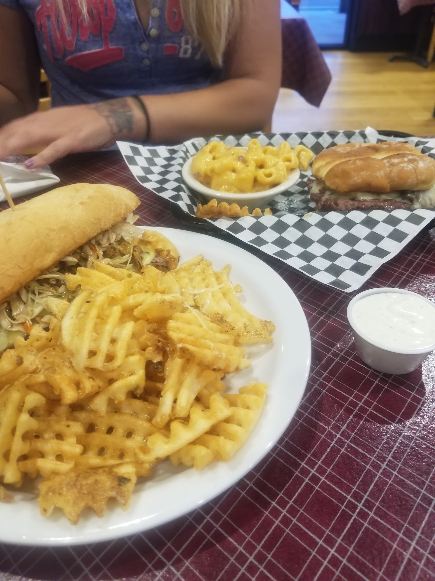Read moreI expected so much more from a BBQ restaurant🤤😕😒. I could smell the smoke in the air and thought my food would have that flavor. We were seated quickly and had to use the 👨💻menus👩💻 to keep the flies off of the table. This being our first time there we didn't know what to order and everything seemed very good. The waitress suggested an appetizer and left to put that order in come back a few minutes later and suggested we try the prime rib so we took her suggestion and asked to add 2 side salads I'm not exactly sure how long we waited possibly 15 minutes and our meals came out then the tater tot appetizer came out and finally our salads. I love a good prime rib but this one was over cooked, dry and not very flavorful. The garlic mash tatters were just bland flavorless potatoes the slaw was good (possibly the best part of the meal) The appetizer was cooked just shy of being burnt🔥. The green salad had more of the white ends of the lettuce but was otherwise good. About this time I had to remind the waitress our dinner rolls didn't make it out to the table. She did immediately go get out rolls and then she asked if we had left room for some 🥧🍰🍨dessert, By this point of the evening I had enough disappointment for one night and politely declined. I did like a couple shirts and wanted to purchase some but just like the dinner rolls our waitress forgot I had asked about them. 🗣 The employees were all friendly just not on their game that night. The restaurant was not busy as it was later in the evening. I hope this was just a off night and not...