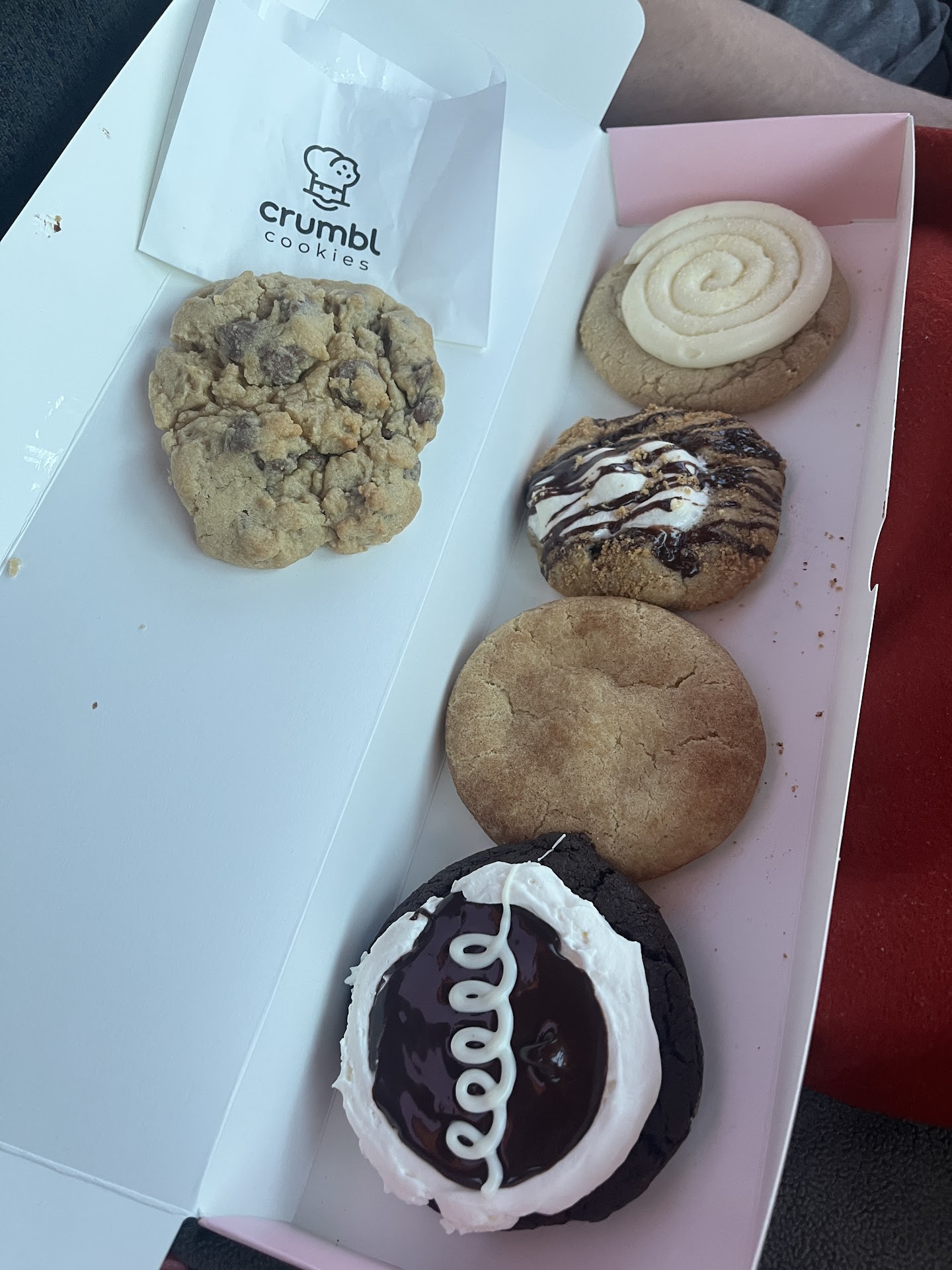 Read moreCrumbl Cookies has an great interior design, love the logo, interesting way of having to order the cookies. I ordered the Strawberry Cupcake cookie and it was fresh and warm, the icing was very light and creamy good flavoring! The sprinkles were a nice touch as well. My Mom ordered the cosmic brownie cookie and she said it was very fresh and delicious. We got my grandma the praline pecan flavor and she enjoyed every bite! It definitely pairs well with a cup of coffee. The staff were very friendly and polite. A little pricy, but you get your mone. worth because the cookies are big. I definitely recommend stopping here for a little sweet treat, or if you want to order a box for a special occasion. Definitely...