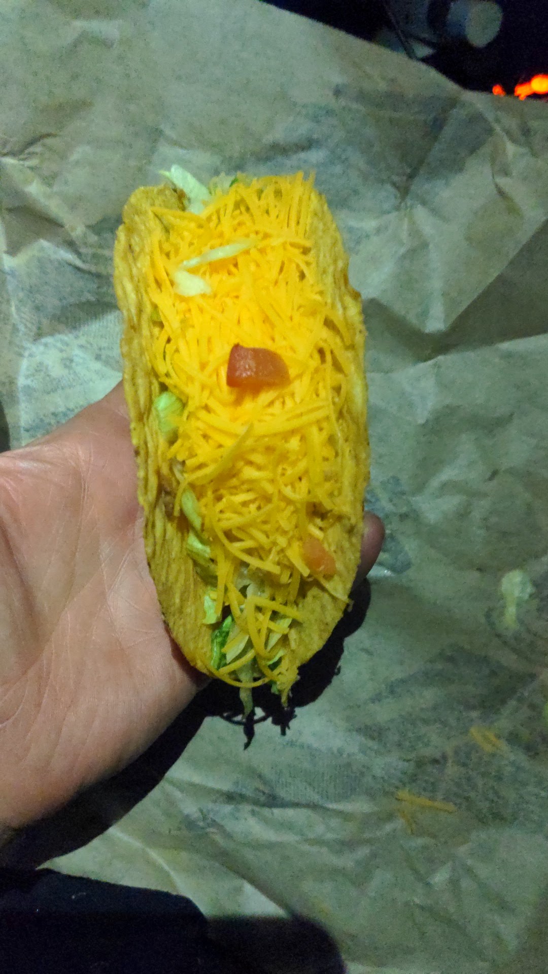 When I got home, we realized that the tacos hadn't even been wrapped. As we tried to lift them out of the bag, they all fell apart. One taco has almost no meat at all, maybe a tablespoon, tops. The rest of the toppings were all over the inside of the bag.