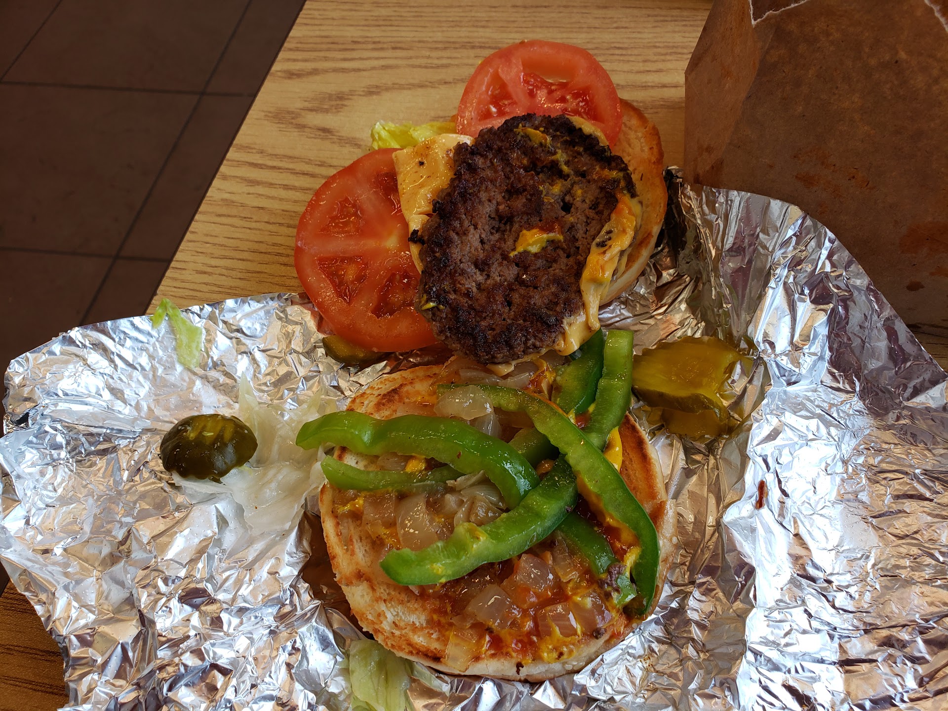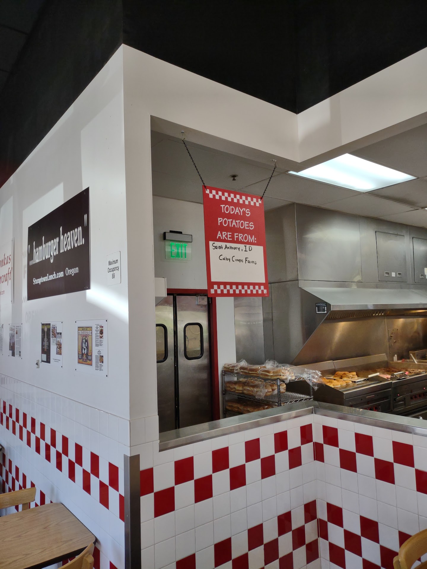 Five Guys on Fairview in Meridian, Idaho, had friendly, polite service, clean facilities, and our hamburgers and French fries were good with large portions. They were also the exact wrong order.