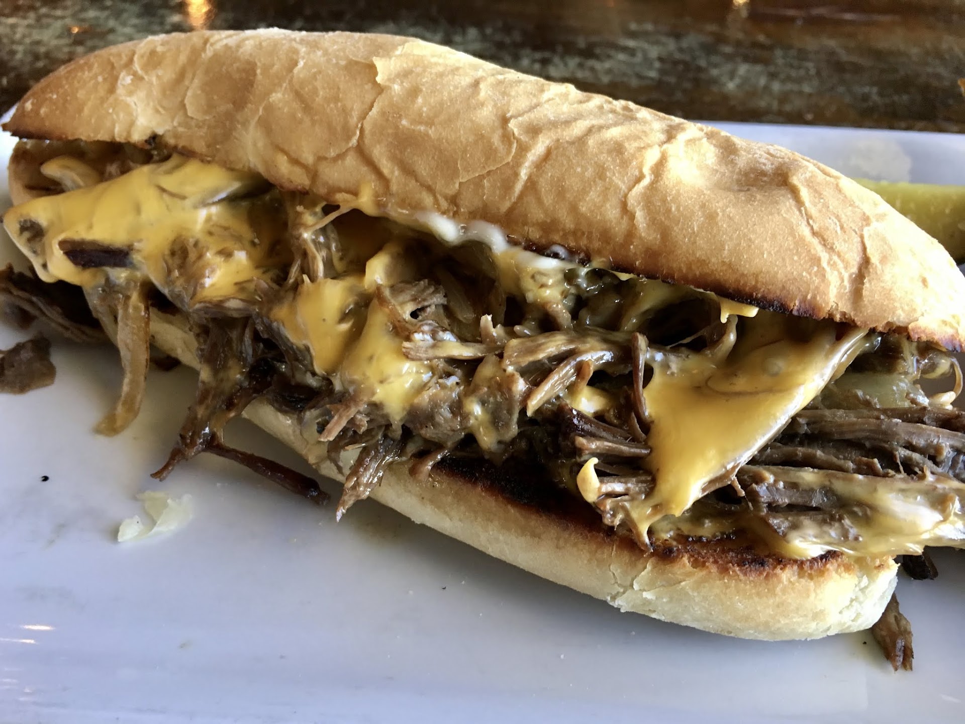 Idaho Cheesesteak ($14) - Slow cooked pot roast served on a hoagie roll with caramelized onion, your choice of cheese (American, Cheddar, Swiss or Pepper Jack), black pepper aioli. Served with house cut fries. Substitute sweet potato fries ($1.50) or half Hidden Valley or Caesar salad ($2.50).