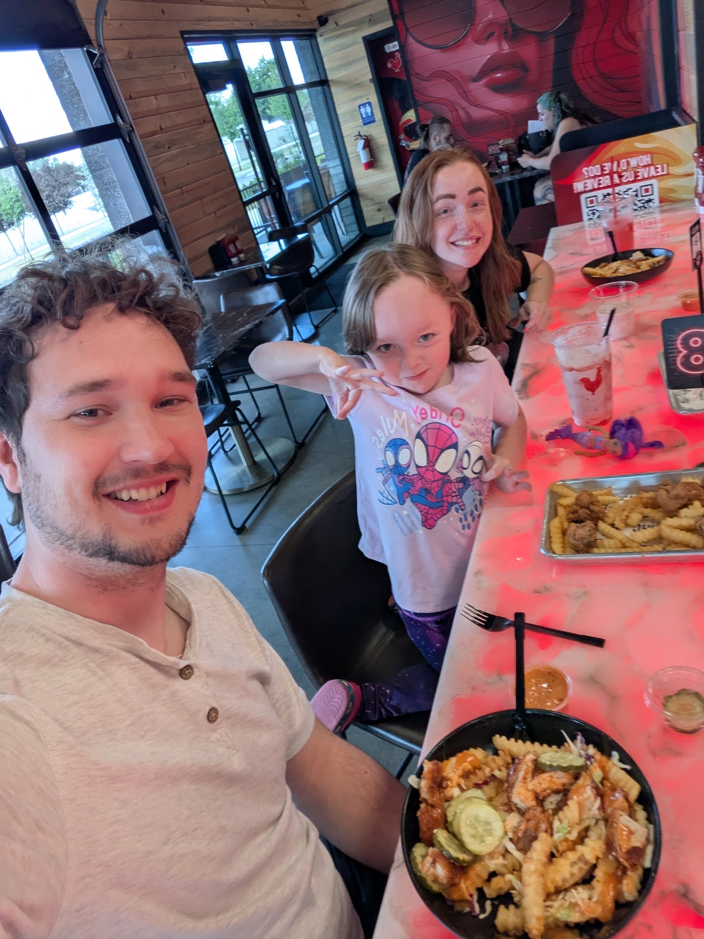 The restaurant has high ceilings with exposed duct work, which gives it an industrial vibe. There are cool counter tops lit from beneath, which change color. There is a good amount of what appears to be light wood paneling along the walls, with some large, bold red images on part of a wall and the bathroom doors. The décor has a modern, youthful vibe. The combination of the most comfortable seating I’ve encountered in a fast/casual restaurant of it’s kind, indoor AND outdoor/patio dining, and great music played at a reasonable volume, gives the sense Houston TX Hot Chicken is trying to appear to a broader customer base than some of the other hot chicken joints I’ve visited locally, which is much appreciated.