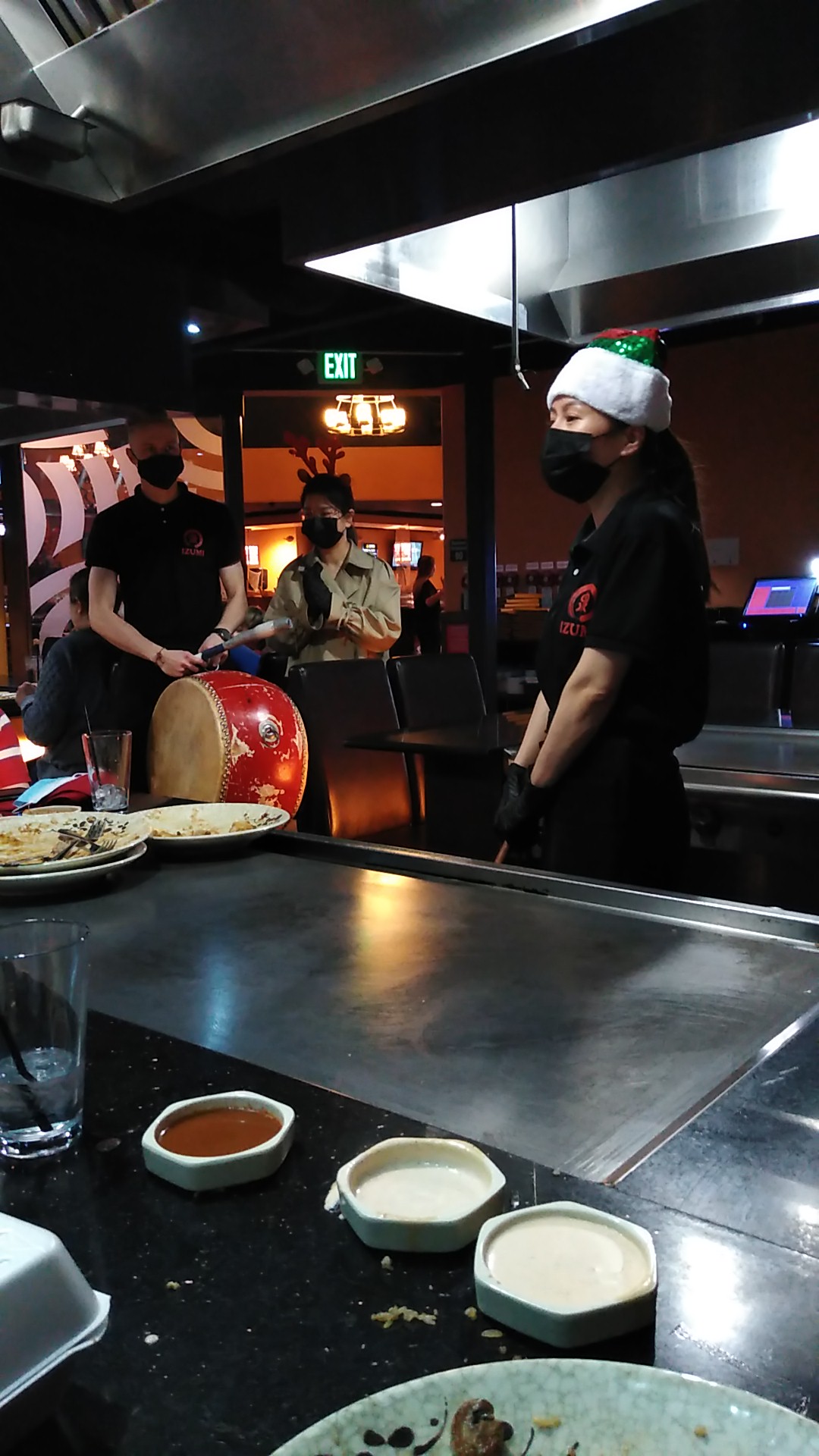 Not sure where to begin. If I could give zero stars I would...had reservations for an early dinner, showed up and they weren't ready for us, had to wait almost 10 minutes to be seated while they got the table ready. Even though they had our name on their books they seemed surprised to see us. They had 2 "hostesses", if you could even call them that. The way they were dressed they should have been working at Hooters. Wearing skin tight legging material type pants and short, almost bra like, shirts. If I wanted a show instead of an expensive dinner, I would go to Hooters and not bring my kids. Once seated it was so dark you could barely see who you were sitting with. The music was ridiculously loud and kept skipping and glitching then starting the same song over and over again, not to mention you had to yell over the music to talk to anyone. It was so loud that the waitress had to keep asking us to repeat ourselves. It took forever to get our drink order in and then again to place our food order. There were only 2 other hibachi tables that already had their food so not sure what the issue was. Our chef eventually came and started cooking but you could tell he was in a hurry. We had 2 young kids and 3 older kids who were looking forward to a show and we got nothing. A few spatula bangs on the grill, a small fireball once and that was it. When it came to when he is supposed to throw the food into your mouth he literally just launched it at our faces, he didn't even give you a chance to get ready, he just threw it at you, then didn't give you a chance to recover before he threw another one at you, hitting you in the face or the head and then moving on to the next person. He cooked as fast as the food would allow, to the point were the vegetables were raw, a tiny bit warm, but raw. The steak, chicken, shrimp, and rice was mediocre but definitely not worth the prices. I also ordered Tobiko, flying fish roe sushi. I know enough about sushi to know the difference between flying fish roe and smelt roe. When the menu says flying fish roe, I pay for and I expect to get flying fish roe, not smelt roe! Once we were done it took forever to get our bill, then even longer for them to come get our card and bring it back to us. We will never go back, it was very...