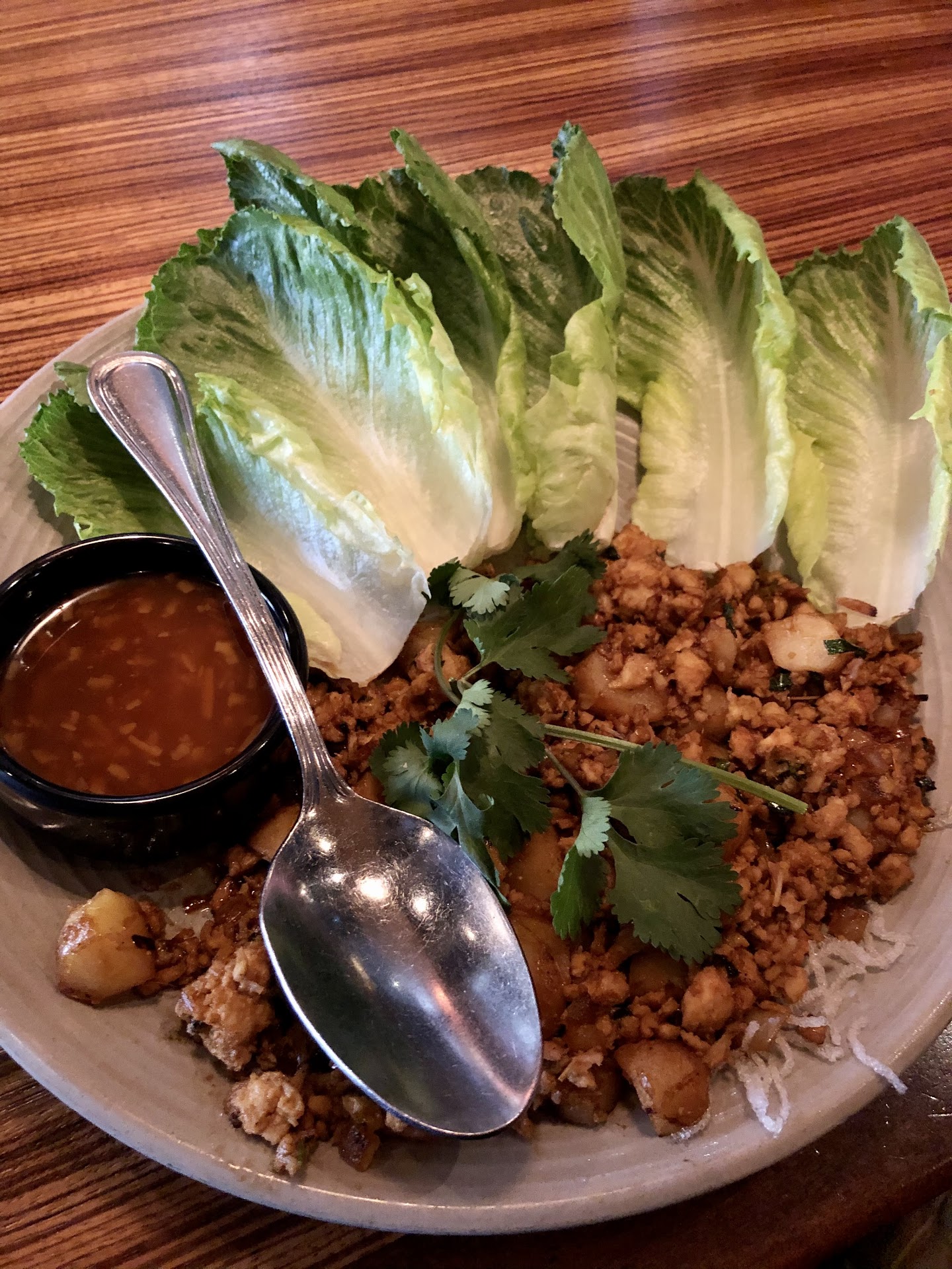 Chicken Lettuce Wraps ($6) - Water chestnuts, onions, lemon grass, Thai Basil, cilantro. Iāve only ever had chicken lettuce wraps once before and that was at PF Changās. I thought these were good.