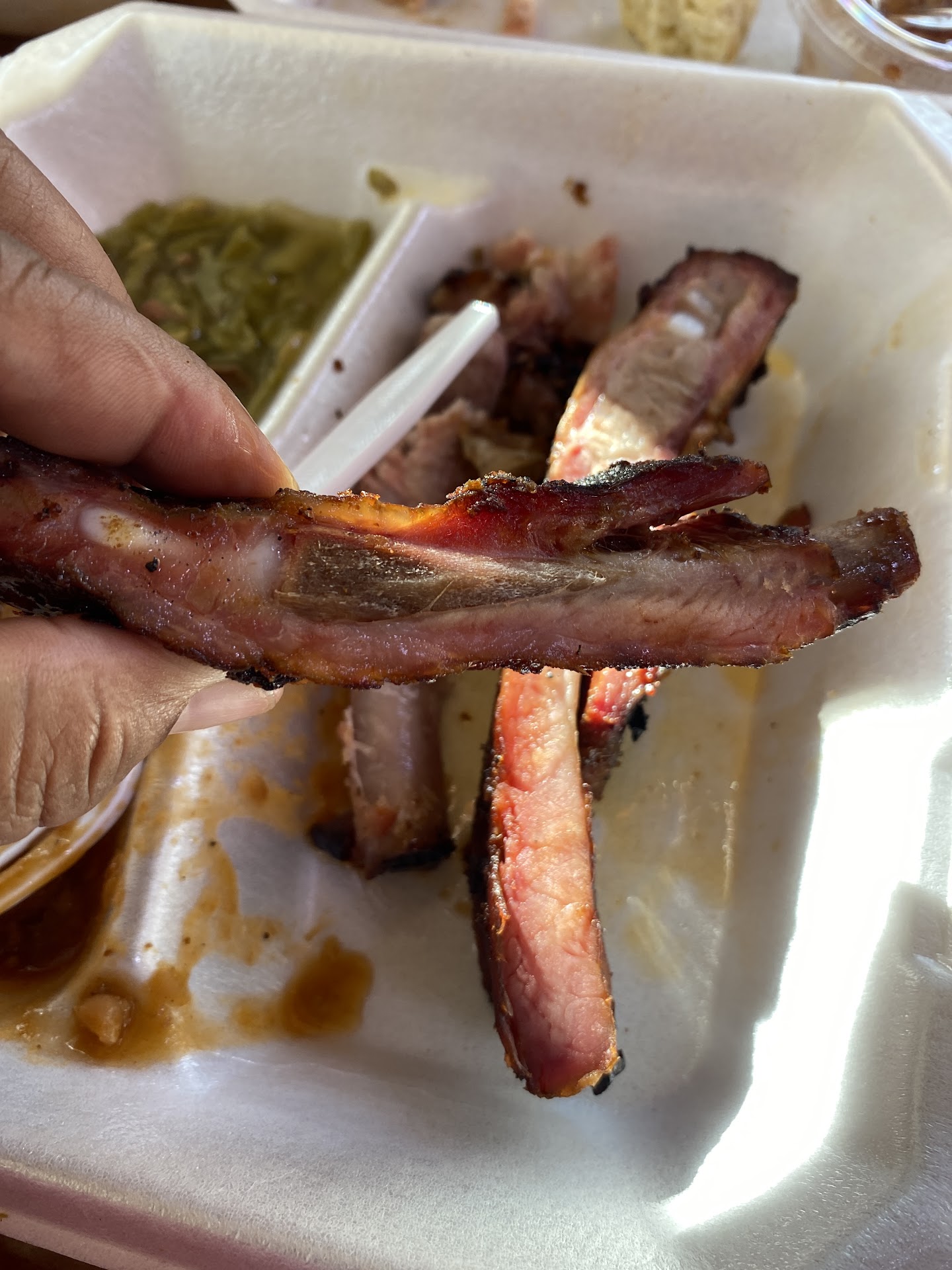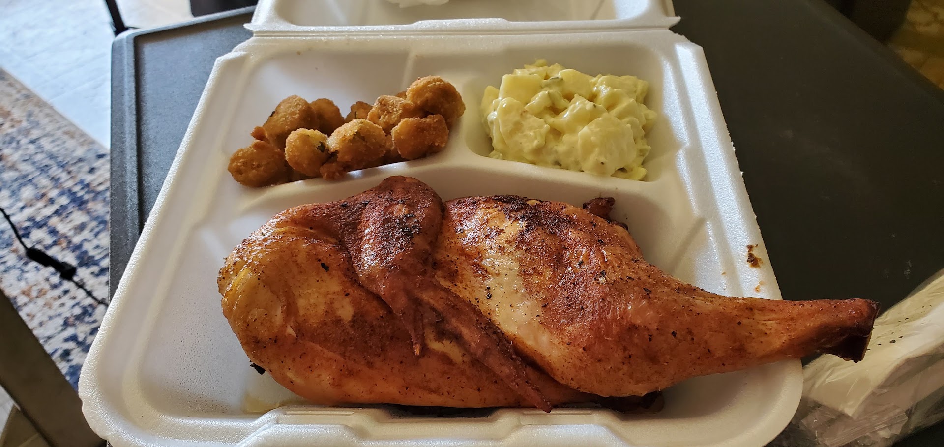 Read moreThe restaurant area was neat and clean. The young lady behind the counter was professional and polite. We went before 5pm believing all the food would be hot and fresh. We ordered the rib & chicken combo to go. We thought we were getting ribs and the bbq chicken. We received end pieces of the ribs and chicken wings. They were very dry and it was almost like eating jerky. The sides were alright. We had cole slaw, green beans, potato salad, and Mac &cheese. I liked the potato salad and green beans the better of the four. They were true to the southern ways to sweet tea and lemonade. Maybe, down the road, we'll give it another try, but go earlier in the day in hopes of not having dry and end piece portions that cost $40 and a tip. I was very disappointed especially after looking at other photo reviews before...