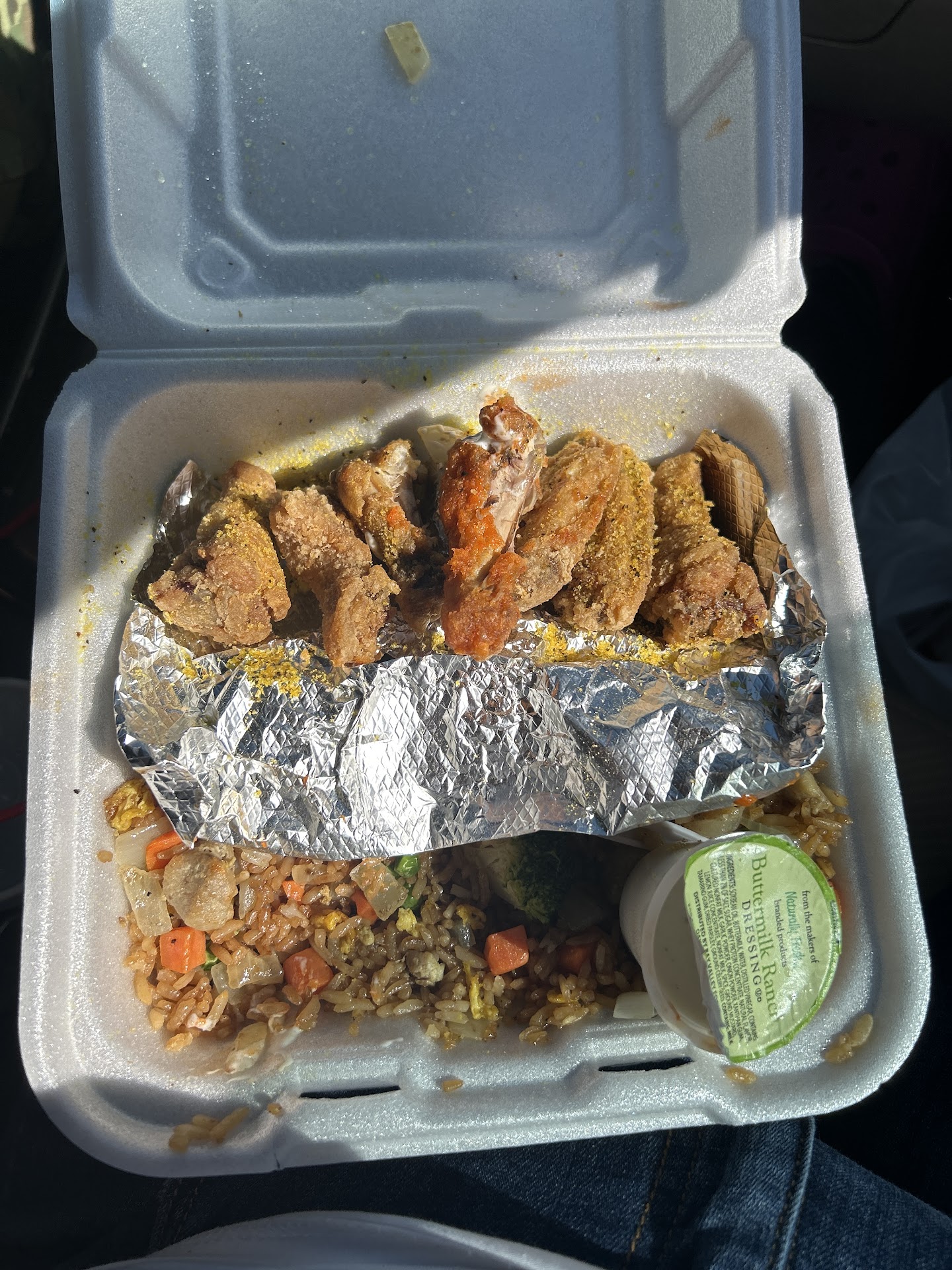 Read moreCashier was nice. Establishment from what could be seen was clean. Time from order to receipt was average. Now….the food. The house rice was a 1 out of 5. Only meats recognizable was the UNDEVINED shrimp, little pieces of chewy off color steak, and no chicken in sight. The veggies might as well been invisible. Fish wasn’t crispy and obviously allergic to pepper, salt, garlic powder, onion powder, seafood seasoning… Wings must be on Jenny Craig. Needed tweezers to hold them. Shall I go on????? The prices overrrrr inflated for some...