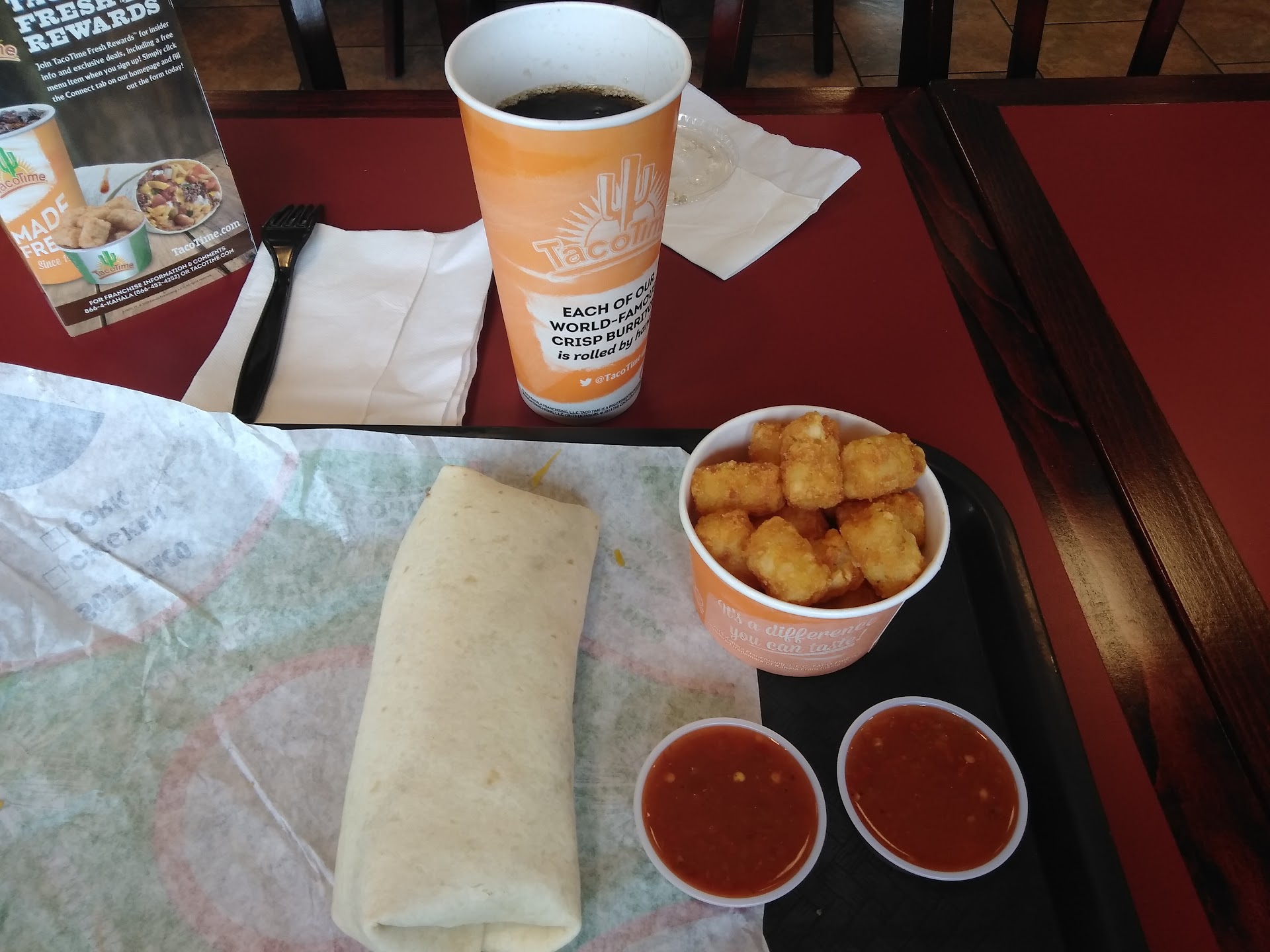 Read moreFirst time at this location. It was terrible. For starters it was extremely slow. 13 minutes before I was able to order. Another ten waiting for food. During the ordering process I wasn't sure who was more confused, me or the person taking my order. I had asked for a seasoned beef taco salad without onions. The person taking my order assumed I didn't want salsa. Again I said no onions. She repeated "So you don't want salsa?" I said I wanted salsa but didn't want my salad topped with onions. She said something I couldn't understand until the end when she told me my total. So I drove up to the window several minutes later, and asked again for no onions but I would like salsa. She stared at me. An older later came up behind her and asked what I wanted. I said no onions on the salad. She asked if I wanted tomatoes. I said yes. We got our food and left. A couple of miles down the road I realized in all that confusion I hadn't received my drink. Called to let them know. They apologized and took my name down so I could claim the drink I had paid for but not received at a later date. Didn't want to go back for it because I didn't have another 30 mins to wait for a coke. After getting on the highway my girlfriend was going to start eating. There was no fork. There were no tomatoes on the salad. Tots were dry and cold. Chicken in my burrito was hard and tasted old. Truly disappointed and very dissatisfied. I like Taco Time. I will NEVER visit this location again. Every other location is always a...