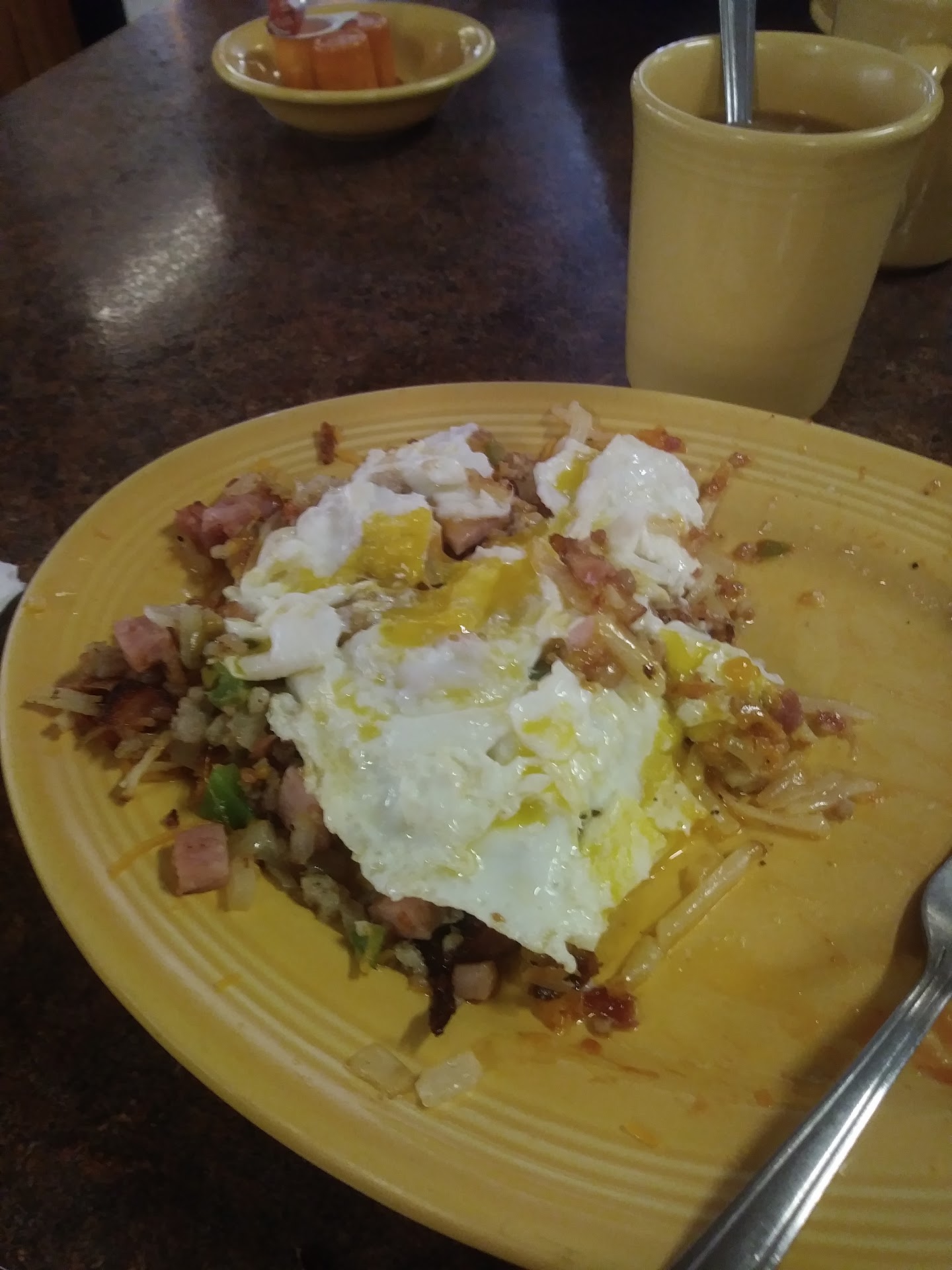 One of my dining companions ordered the chicken fried steak, and it arrived overcooked and rubbery, with no seasoning or flavor to speak of. The sides were equally unimpressive: hashbrown potatoes that were bland and over cooked hard (almost as if they were from a box), and undercooked eggs that were soggy. The food was so disappointing that we couldnât even bring ourselves to finish it, leaving much of our meals untouched.