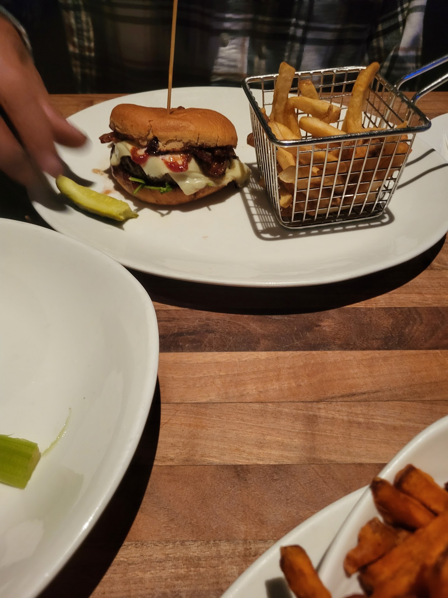 The food: we've been going to this establishment for 5 years. They recently took the Beyond burger off the menu, which is what we usually get. The veggie burger they offer is akin to a pan fried falafel, which is fine. Years ago, one of the servers asked if I'd like sauteed mushrooms on the burger and it was awesome so now, every time we come, I ask for that. Most of the time they don't put the mushrooms on the burger so I have to ask again. This happened again today. My husband got the two pepper burger and always asks for no cheese and sub in the veggie burger. But they almost always put the cheese on the burger and he has to try to pull it off, which doesn't really work.