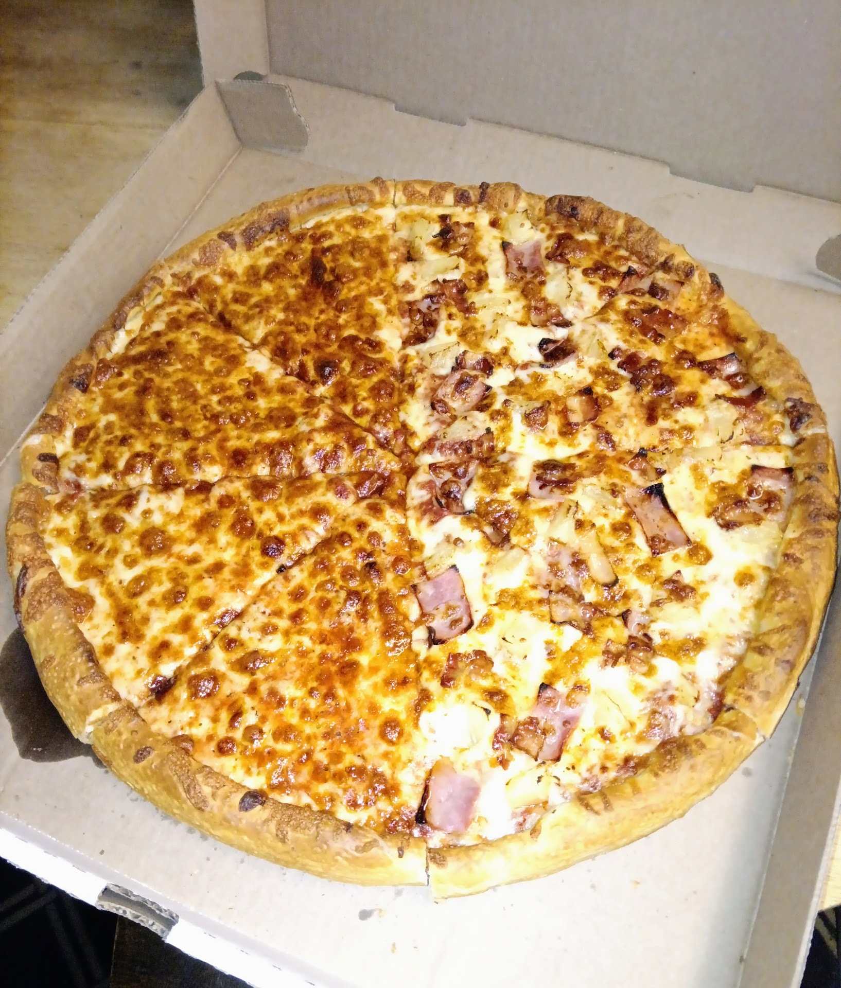 "New Customer" I have never been here before. Good phone customer service. My order went through well. I ordered a Large Cheese Pizza. Hand tossed, 1/2 Cheese. The other 1/2 Hawaiian. Ham, Pineapple, and Bacon. The delivery guy was very nice, polite and on time. Pizza was hot. I appreciate them delivering a little after closing time. TY. I love their tomato pizza sauce. Their Hand tossed bread and pizza crust. Is just Perfect. Cheese good. Ham, Pineapple and Real Bacon. There was a little bit of grease from the meat. Is Normal to be expected. The all around taste was absolutely Delicious. Big slices on a large. 2 slices for me. I was full. We have leftover pizza. For dinner tomorrow night after our Merrimack Babe Ruth baseball game. Would I order Mr'G's Pizza Again. Yes I would. 👍😊 I Give a 5 Stars ⭐ Great...