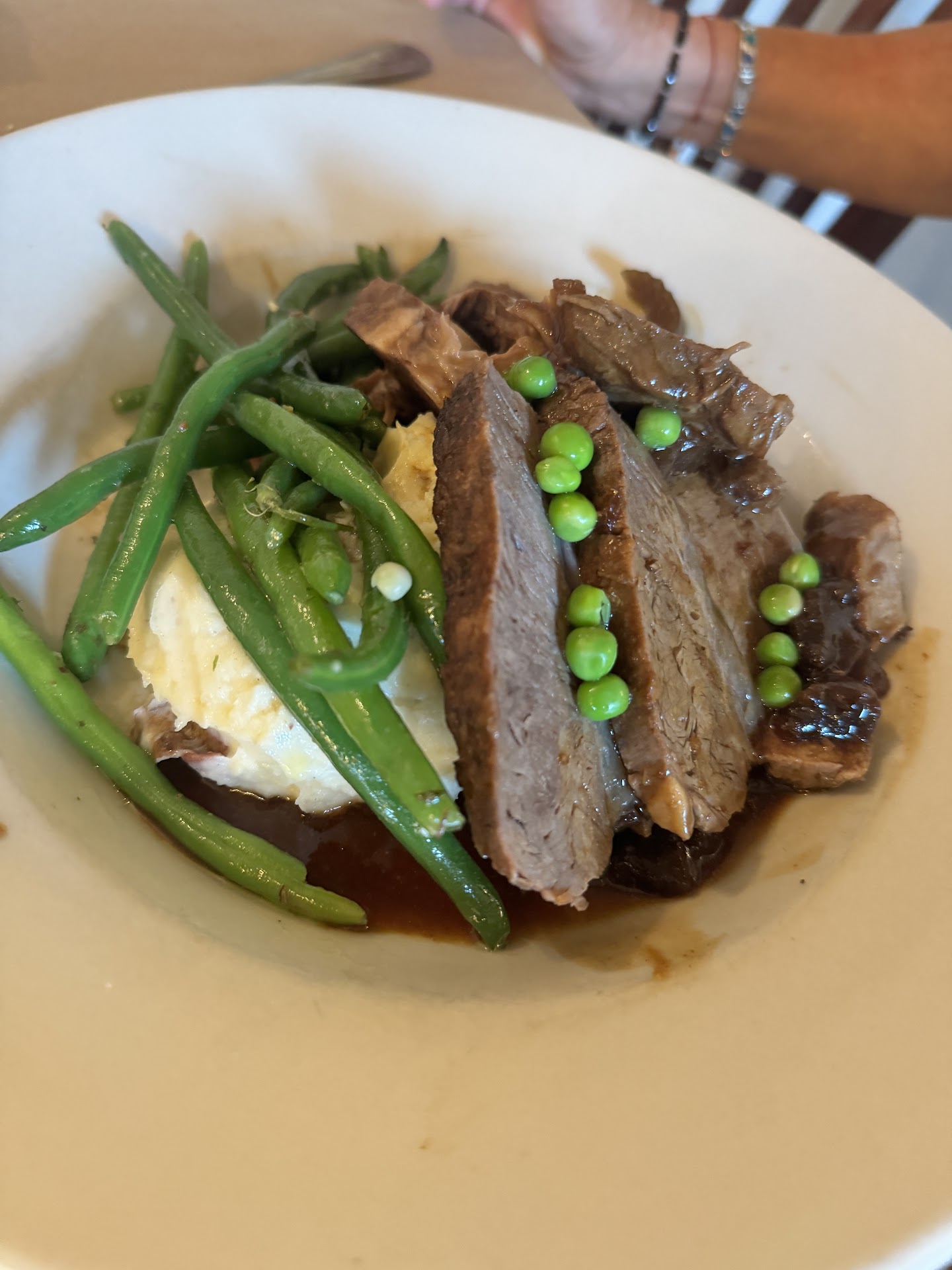 My partner had the special salmon entree with dijon sauce, highly highly recommended if this item is on the menu. I had the ginger soy tuna dish with noodles, quite good. But for me, the standout dish was the pot roast ordered by my friend, wow!! I'm not normally a fan of pot roast but the meat was super tender and the sauce completely delectable. I was only going to take a taste, but wound up taking three, and had to restrain myself from taking more, it was so good.