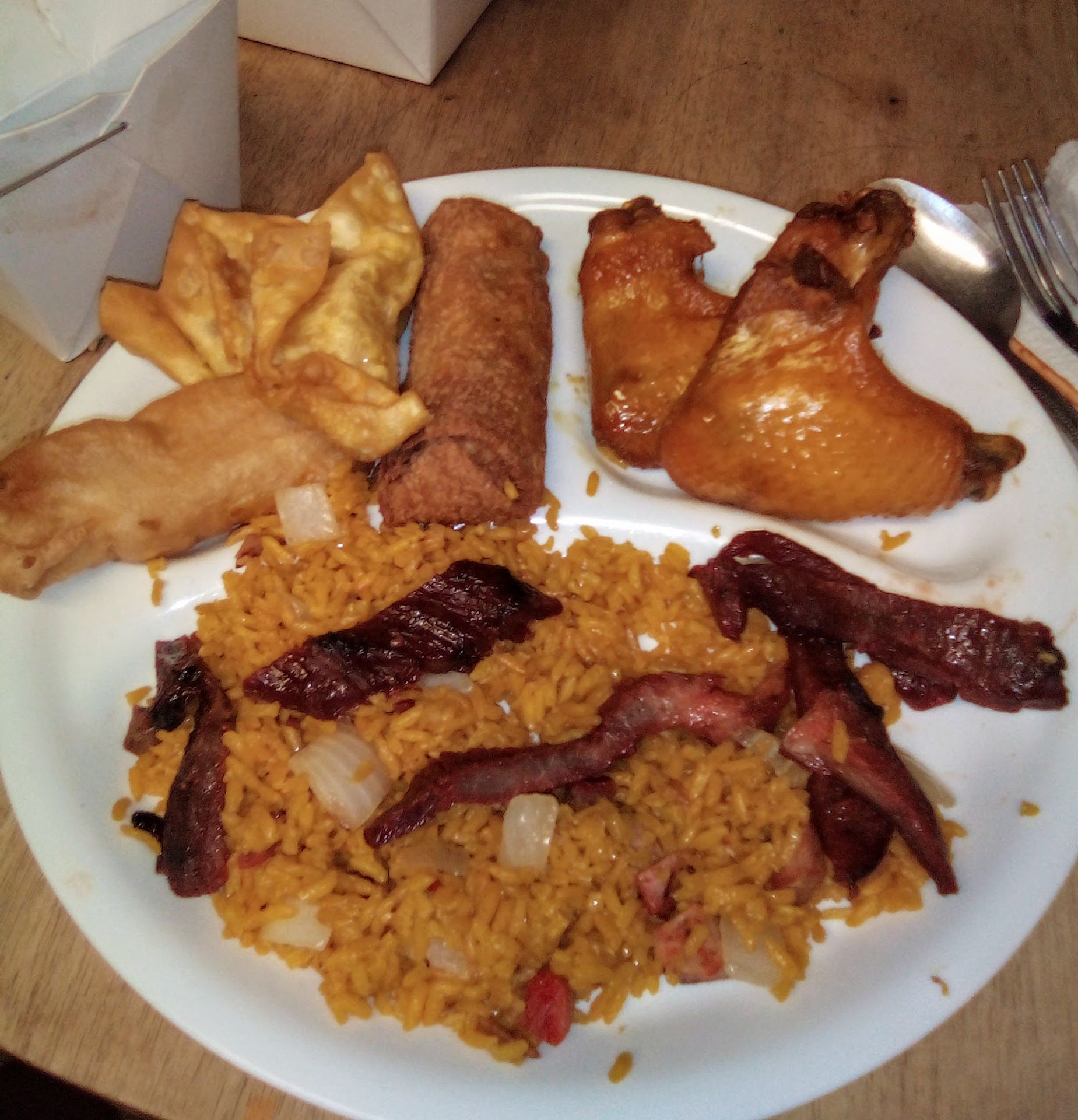 Soup had a burnt type of taste to it, not sure how. The teriyaki chicken was on the drier side and small. General tso was more sweet (orange color sauce with pepper flakes instead of peppers and deeper red sauce) than I like. Pork fried rice was unevenly cooked, some were harder than most and the rice was bland in taste.
