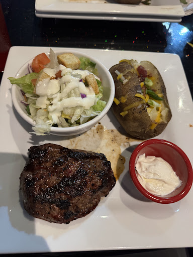 The steak was cooked to a medium rare, no knocks on the grill master. However, it was far from USDA Prime. It was OK for a cheap steak, but nothing to write home about. The Caesar salad was well dressed, composed of fresh lettuce and junk croutons. This was a bummer as the dressing and lettuce were great. The loaded baked tater was edible, but I have to admit that I have had better. To that point, I've also had worse, making this average. The onion rings were cooked to a perfect doneness; however, the ranch dressing on the side was disgusting, and the rings themselves were of bottom-of-the-barrel quality. The rings themselves warrant a one-star review.