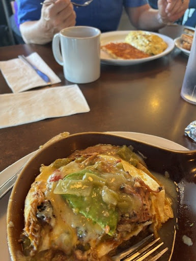 For our meal, I ordered the huevos rancheros with green sauce and pork green chili. The dish arrived hot and flavorful, hitting just the right balance of spice and comfort. My wife enjoyed a fluffy California omelet, completed with hash browns and toast, which was equally delicious and served at the perfect temperature. The presentation of both plates was carefully executed, making the dishes look even more appetizing and adding to the overall enjoyment of the meal.