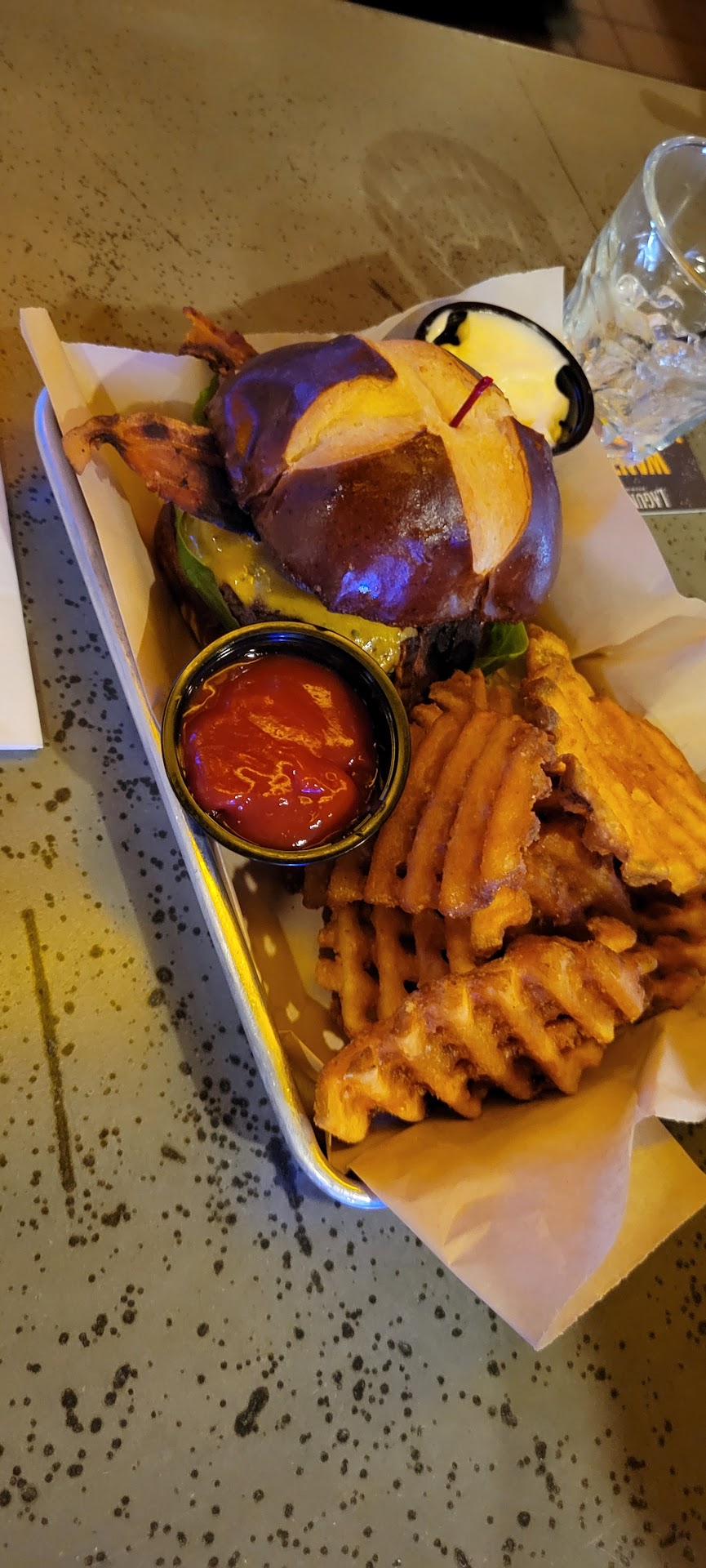My food was waiting for me. If you have not had a California Carver burger from Boulders, please correct that. They always cook it perfectly to order, not a half cook and refrigerate like some. The onion straws are crispy, the pico could have a little more spice (arguably) but the arugula and the perfectly seasoned and cooked burger well makes up for such a subjective slight. The waffle fries curiously were overcooked and had no seasoning on a togo order, but this Time they were perfectly cooked and had some sort of salty parmesan sprinkling.