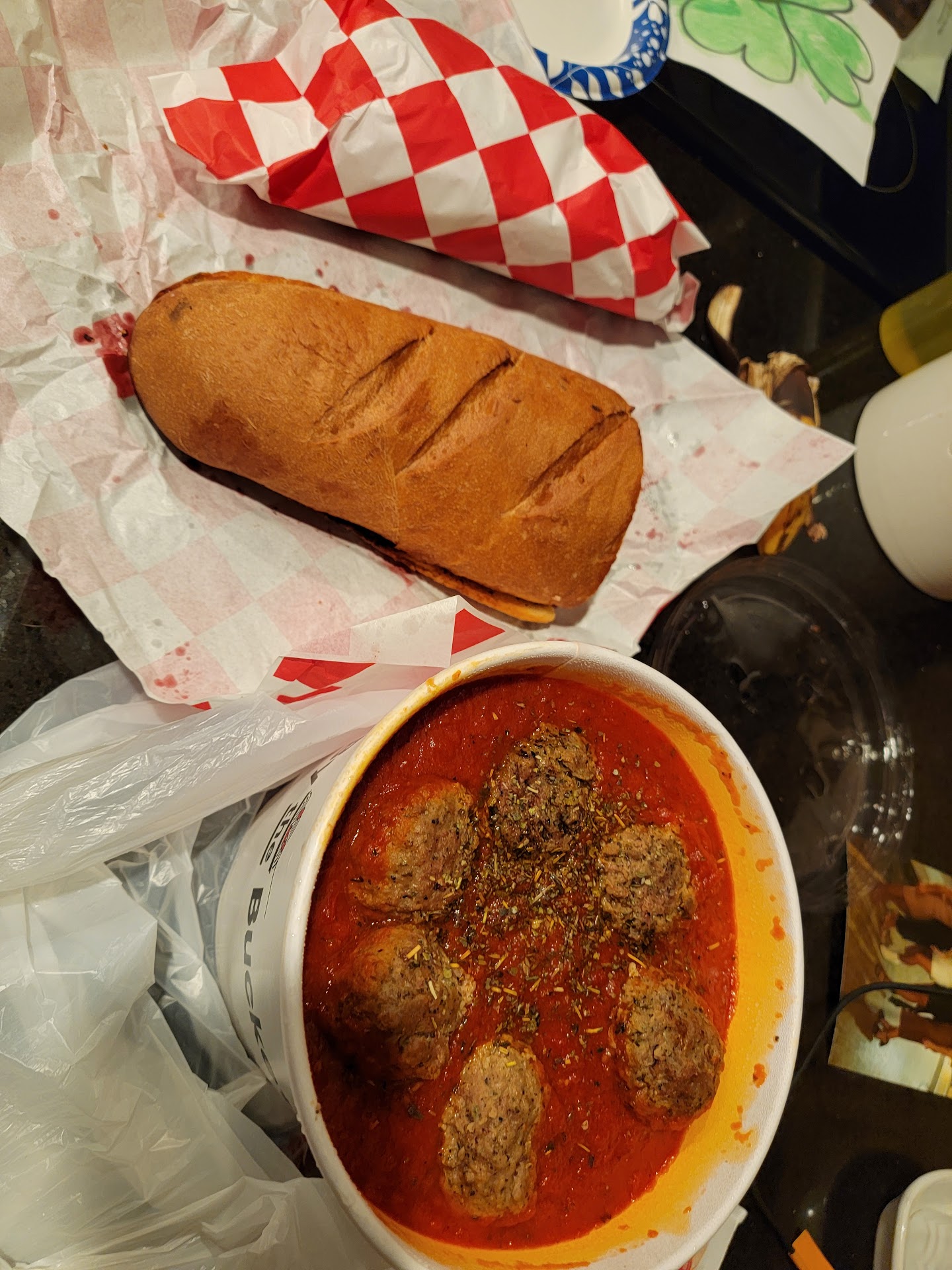 There was barely any sauce on my 10 meatballs or on my family bucket. My half loaf of garlic bread didn't seem to have any butter and was so dry I thought I'd have to perform the heimlich on my kid when he started to choke on it. Same thing with my full loaf of cheesy bread. The meatballs were missing that buttery garlicky flavor that makes them phenomenal and they just tasted like balled hunks of meat. However, their consistency and lightness is still there.