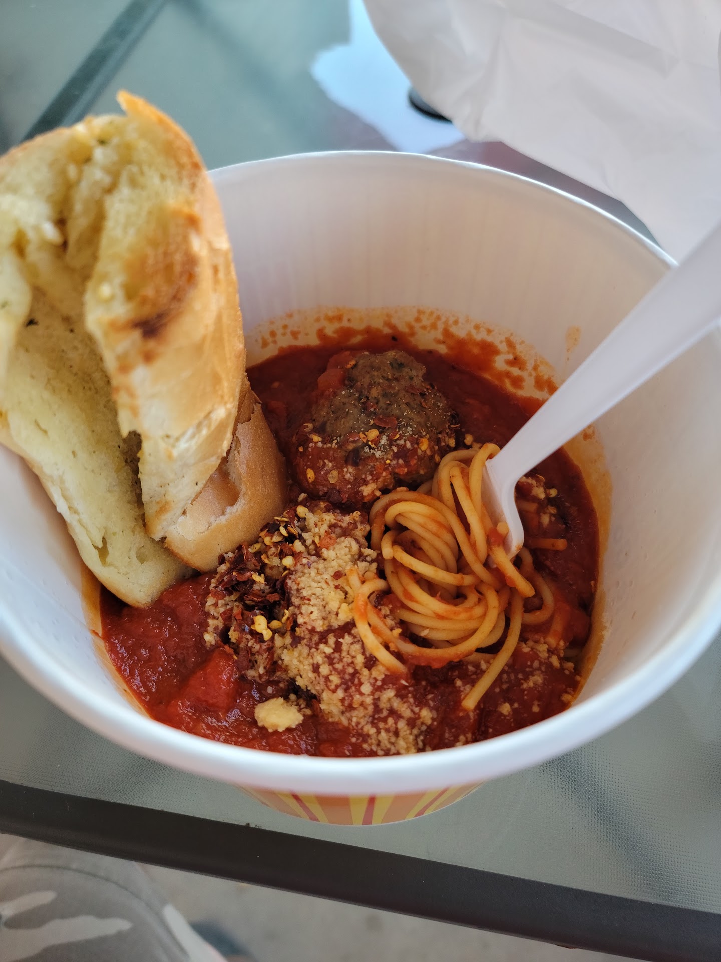 It's time to talk about the food, the real reason of this review. Absolutely delicious and second to none. Spaghetti cooked to perfection with an exceptional marinara sauce that surpasses Olive Garden and Buca Di Beppo. It's super affordable compared to those places as well. A mere $10 will get you a large helping of spaghetti, garlic bread, and a delicious meatball, all of which fill you up.