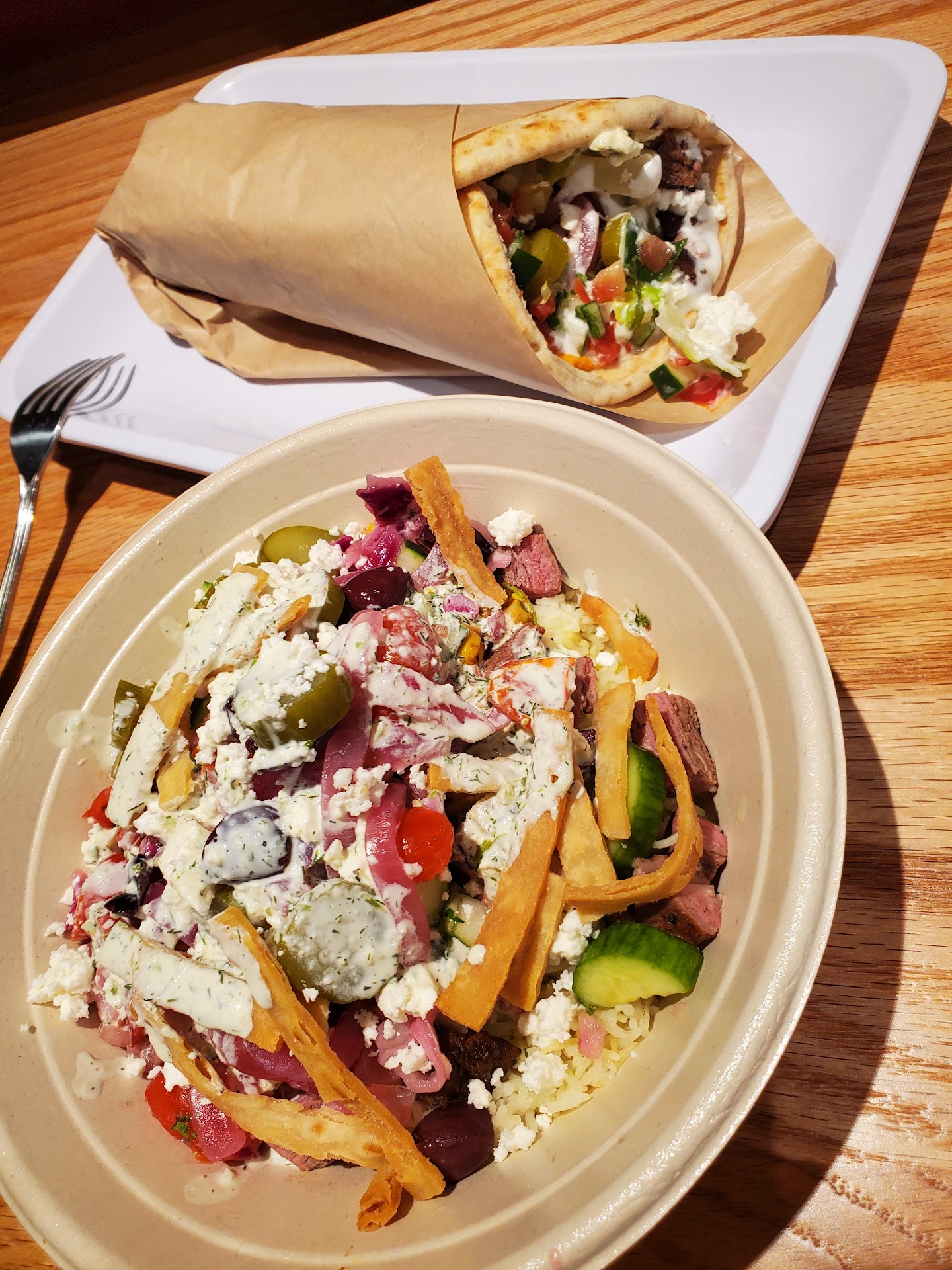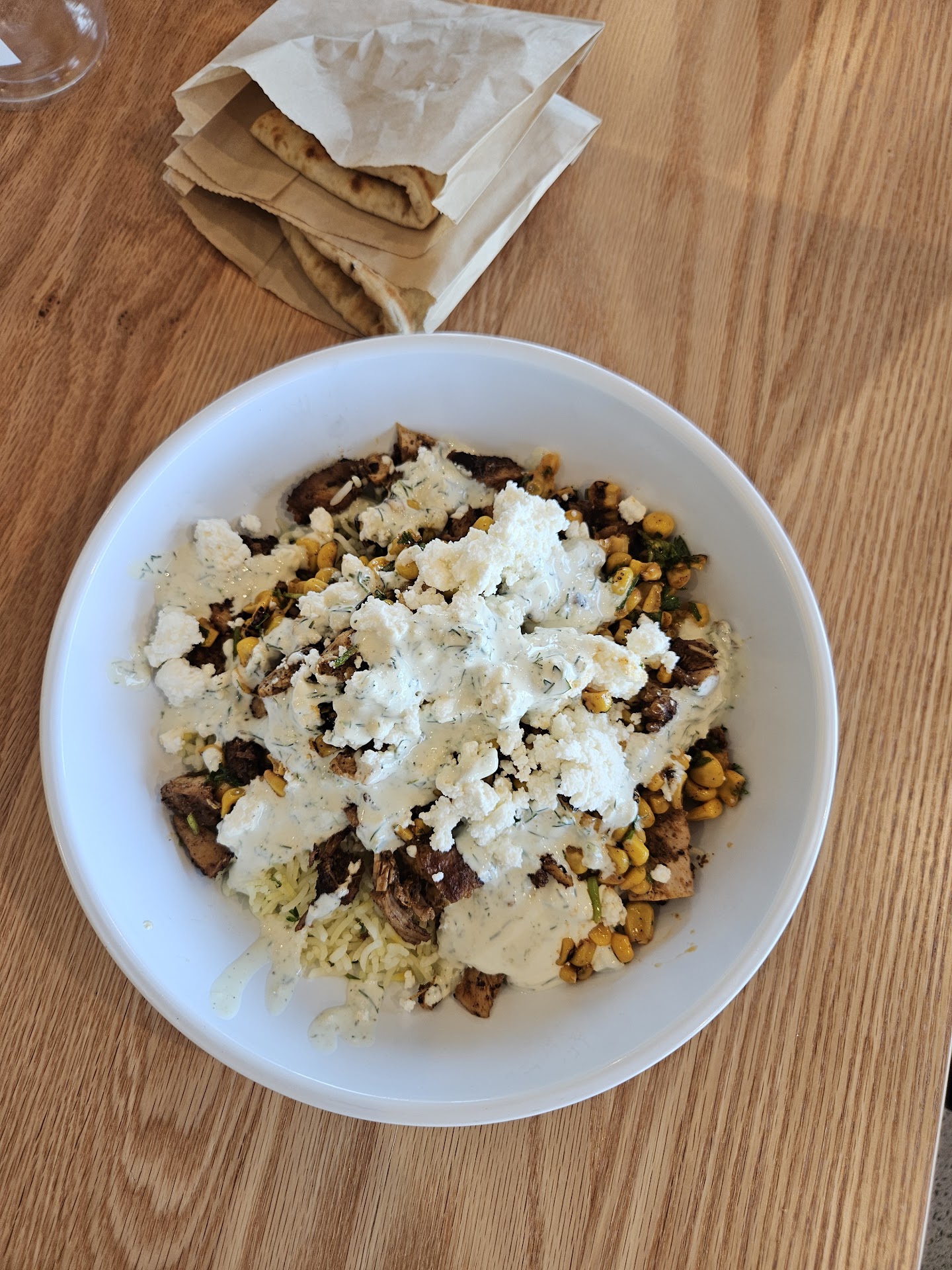 I ordered a bowl with half saffron rice and arugula. You can choose 3 dips so I got: Roasted eggplant, Tzatziki, and Red Pepper Hummus. I ordered grilled chicken, but I've had their lamb before and that is also a good option! I also got it with: fire roasted corn, pickled pickles, persian cucumber, kalamata olives and my dressing was yogurt dill.