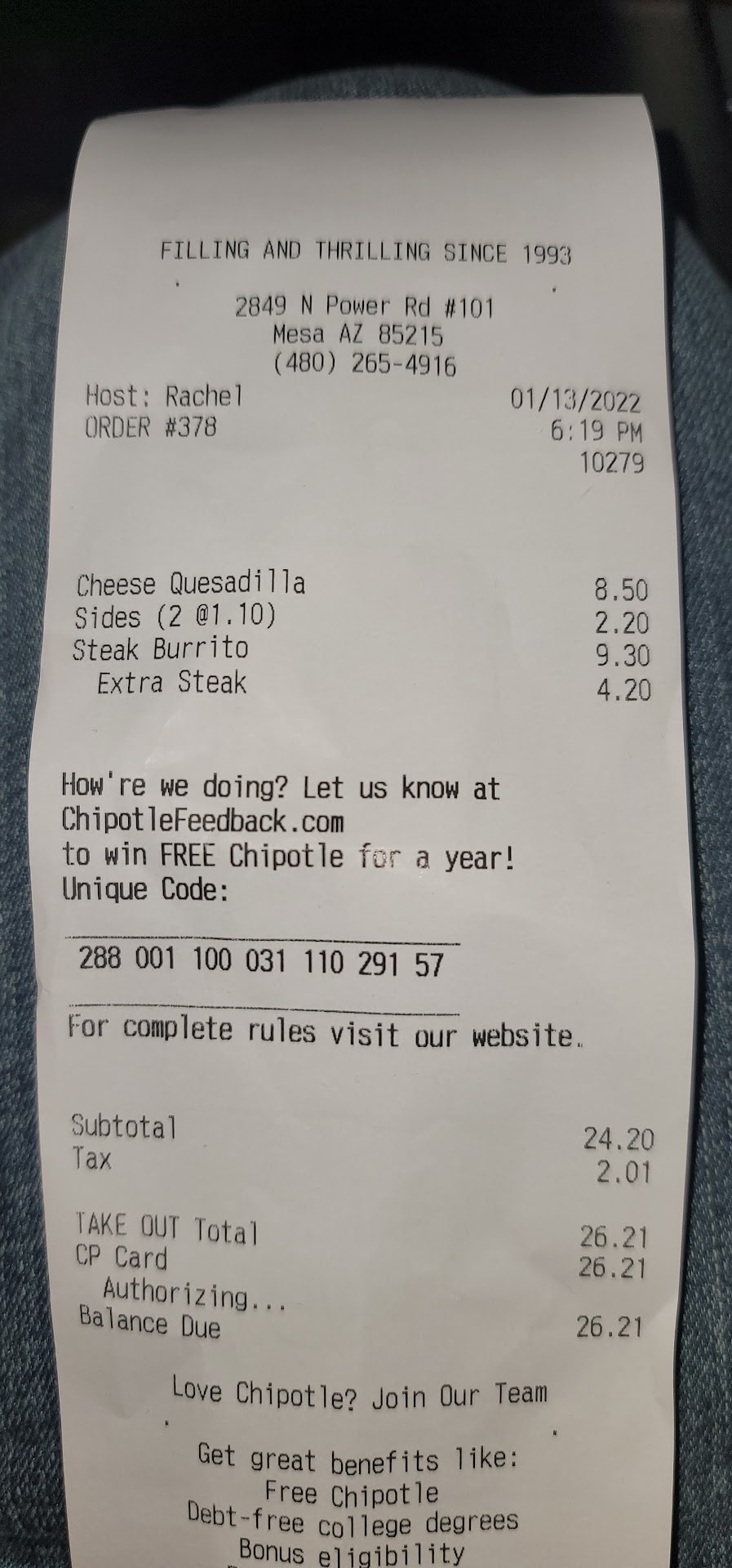 Read moreI hate to be the bearer of bad news but the truth is I have been to Chipotle's from Arizona to Florida and it's started off when they first opened to be like amazing and delicious. But then as time has gone on everything has slowly gone to crap. I went there on Monday veterans Day to feed my two granddaughters before they went home with their parents after a long weekend visit. First thing I noticed which is of course what I always notice at every Chipotle is how there are several workers working the prep counter is filthy and for whatever reason God only knows this has happened all over the country and it happened at this location too when a worker is putting the food into the bowl if they miss the bowl for an example lettuce. They pick it up with their dirty gloved hand and put it back into your bowl which just fell onto a dirty prep table, it happens at every location and irks me to know and because that's disgusting, that's why people are getting food poisoning. That's the reason why people complain about your food hello. So first and foremost better training needs to happen on how to correctly prep food. Food was cold and my brown rice was crunchy. So my rice was not cooked properly. And my bowl was very skimpy hardly any meat. Hardly anything else. And I paid what 12 bucks for it. And the other thing that irks me is you have several young workers in there. None of them clean the tables. None of them peruse the dining area to clean tables so people as they come in can sit down and eat their goddamn food. Now, I'm not sure if these restaurants are franchised or corporate owned, but serious training needs to happen. I've looked all over the valley at all. The Chipotles and everybody has three stars or less and the complaints are always the same and I really believe y'all need to do better. Because the truth is people love it. The food is fresh and great And has a great concept if only folks would...