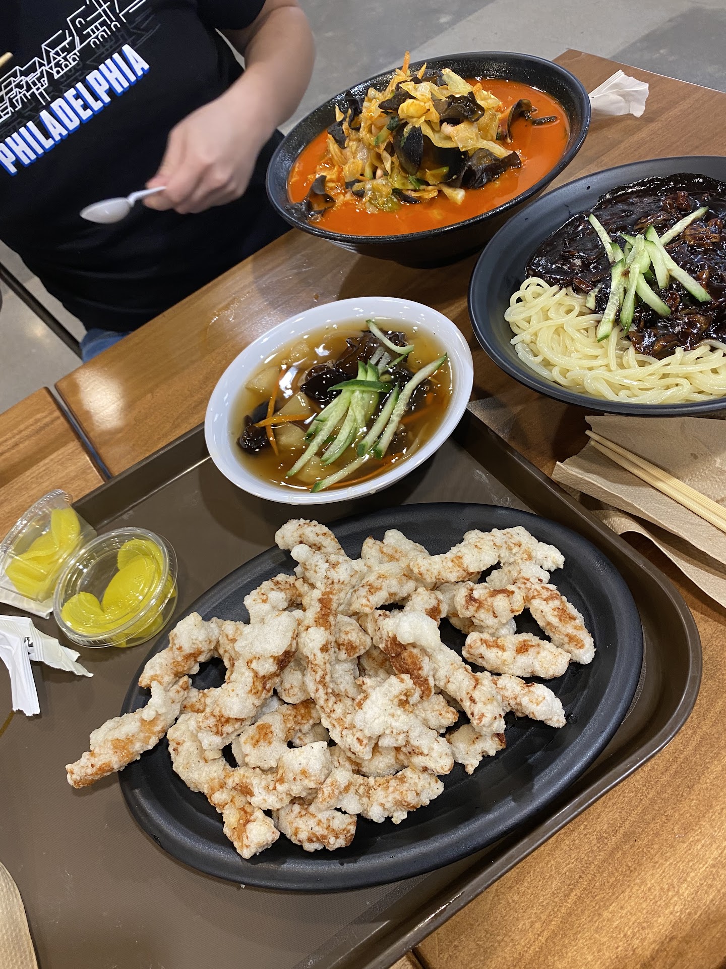 My fiancée and I were excited to eat some Korean food after a long day of exploring apartments in Phoenix Metro Area. This booth is located in a food court with other various Korean food in Hmart. Placing the order was easy and the cashier was nice. They give you an order number and call it through speaker when your order is ready. We ordered the Jjamppong, Jjajangmyeon, and Tangsooyuk. Holy Moly! First off, the portions are huge! My picture does not do it justice! Second, it was super delicious! I was barely able to finish my jjajangmyung. But with the help of the pickled radish on side, I pushed through. My fiancée had the Jjampong and it was filled with lots shrimps and mussels. Tangsooyuk was very crispy and with the sauce on the side, it doesn’t lose its crispy-ness and still delicious. We had leftover tangsooyuk which never happens whenever we order it. It made us sad since we could not pack it as leftover. We ate around 4pm and felt content for the rest of the day. We will be back when we come back to...