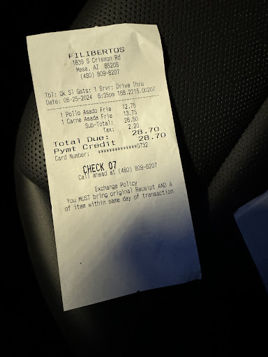 Read moreI am EXTREMELY upset about the order I placed, and the order I received! After an 8.5 hour shift at work on my feet I hadn't eaten ALL day and after a quick stop at Walmart I stopped through the drive thru of Filiberto's @ Crimson/Baseline and ordered my favorite, Texas burrito. There was no one ahead of me in the drive thru yet I waited over 5 minutes for my food. I drive straight home which is less than 10 minutes away. Imagine my surprise when I cut my burrito in half to discover it was a BREAKFAST BURRITO!!! (Eggs/cheese and what seemed to be sausage) I immediately called the store, (3 times) but got NO answer! You see where it says on the bottom of the receipt that I must return the WRONG food the same day? Well I'm NOT driving back up there when it wasn't MY mistake! You can't even get an answering machine! This used to be my favorite Filiberto's as the on @ Sossaman/Guadalupe isn't open 24 hours and I work until 10 pm. Well NOT anymore! I paid almost $10 for a burrito I DIDN'T get and no one has the courtesy to answer the phone! I want a refund AND a replacement of the burrito I was SUPPOSED to get and paid for! I did eat half of the breakfast burrito I received, and although it wasn't bad, it's NOT what I wanted or paid for! I don't know how they could make such a huge mistake when they weren't even busy! I wonder if the person behind me that probably received my Texas burrito is as upset as me!?!?