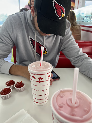 There I was, 110 degrees outside, when I saw the in-n-out burger glowing in the distance. I needed a break and a great meal. I haven't had it before. I was visiting from out of town where it never gets 110 degrees and my skin doesn't melt off. I was hoping this place could be an oasis for my parched mouth. I walked it at like 5pm. Place was packed. I'm talking, not a table available, and there were a ton. Must be good! A normal burger joint would have plenty of seating this time of day. But not this place. This place was an In-N-Out! The menu doesn't have a thousand things to choose from, so people order quick, and service is fast. There was a lady there who had something going on with her mental health, and as she stood there, a few feet from the counter, she peed herself. It spread onto the floor. Two employees, Braelyn and Corey, were on it. Corey didn't have a smile while cleaning it up, but I wouldn't have either. Gross. Braelyn had a Big Ole Grin! She was loving her work! What a great attitude! Both of them didn't mess around. They cleaned the spot, then the rest of the dining area like a well oiled machine. After they cleaned up, they washed up really well, and then they were back behind the counter. Everyone was working like busy bees. Everyone was doing something or helping out other coworkers which made all the orders seem like they were done fast. Because they were fast, people were able to eat faster and tables opened up faster. People were in-n-out if ya know what I'm sayin! The only issue I had were the fries. I should have ordered mine crispy and I didn't. They cut the potatoes right there so they are super fresh. If you like crispy fries, just order them that way and they will be on it! And get grilled onions on the hamburger. Super delicious. They have different "styles" of burgers but I didn't see these nicknames anywhere. You'll have to google that. But this location was great, cool, and had a great staff. Eat here....