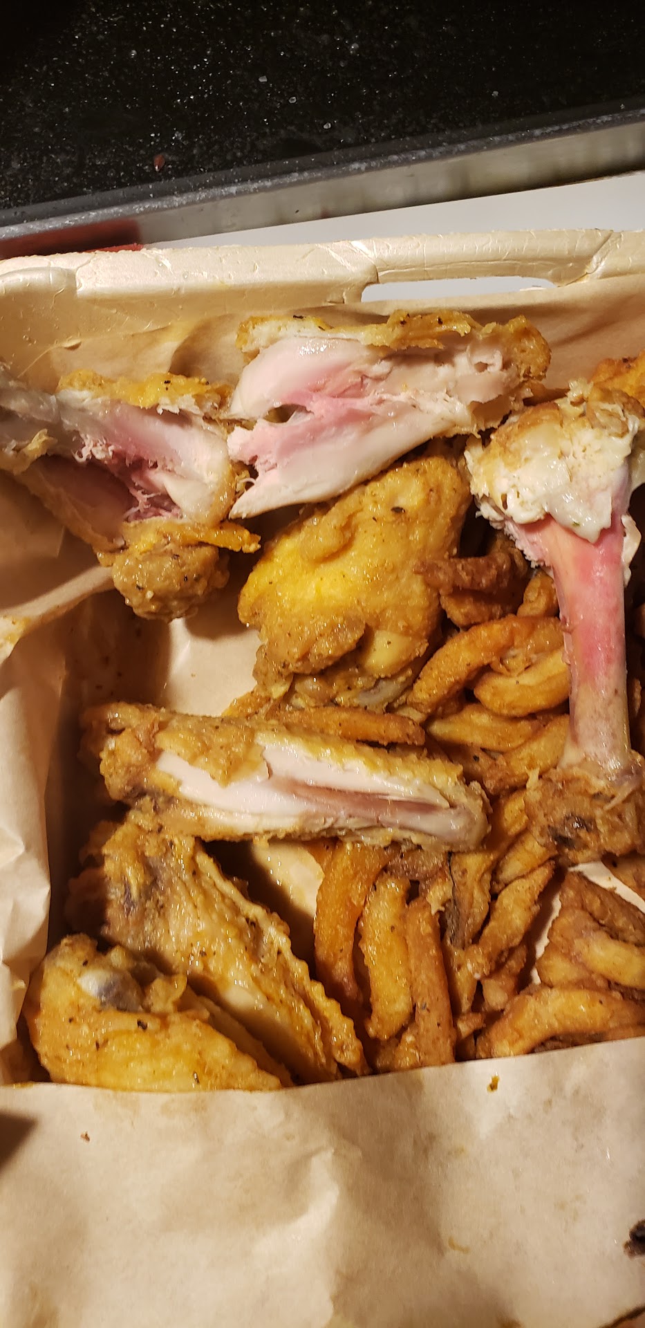 More than half the wings were not cooked. The pictures included were not from eating. After the first one was so red, we tore apart the wings and the next 9 were just as red! Out of the 32 wings we got we were able to literally eat less than 5 before we stopped completely and threw it all away! The chicken was freezing! The curly fries were more than soggy and mushy and again, freezing! We waited over an hour for the food and still wasnât able to eat it and had to get something else. Contacted the restaurant and spoke to the âgeneral managerâ who was more than dismissive and âassuredâ us no one would get sick and was FAR from helpful or apologetic! Contacted corporate as well.. will update when...