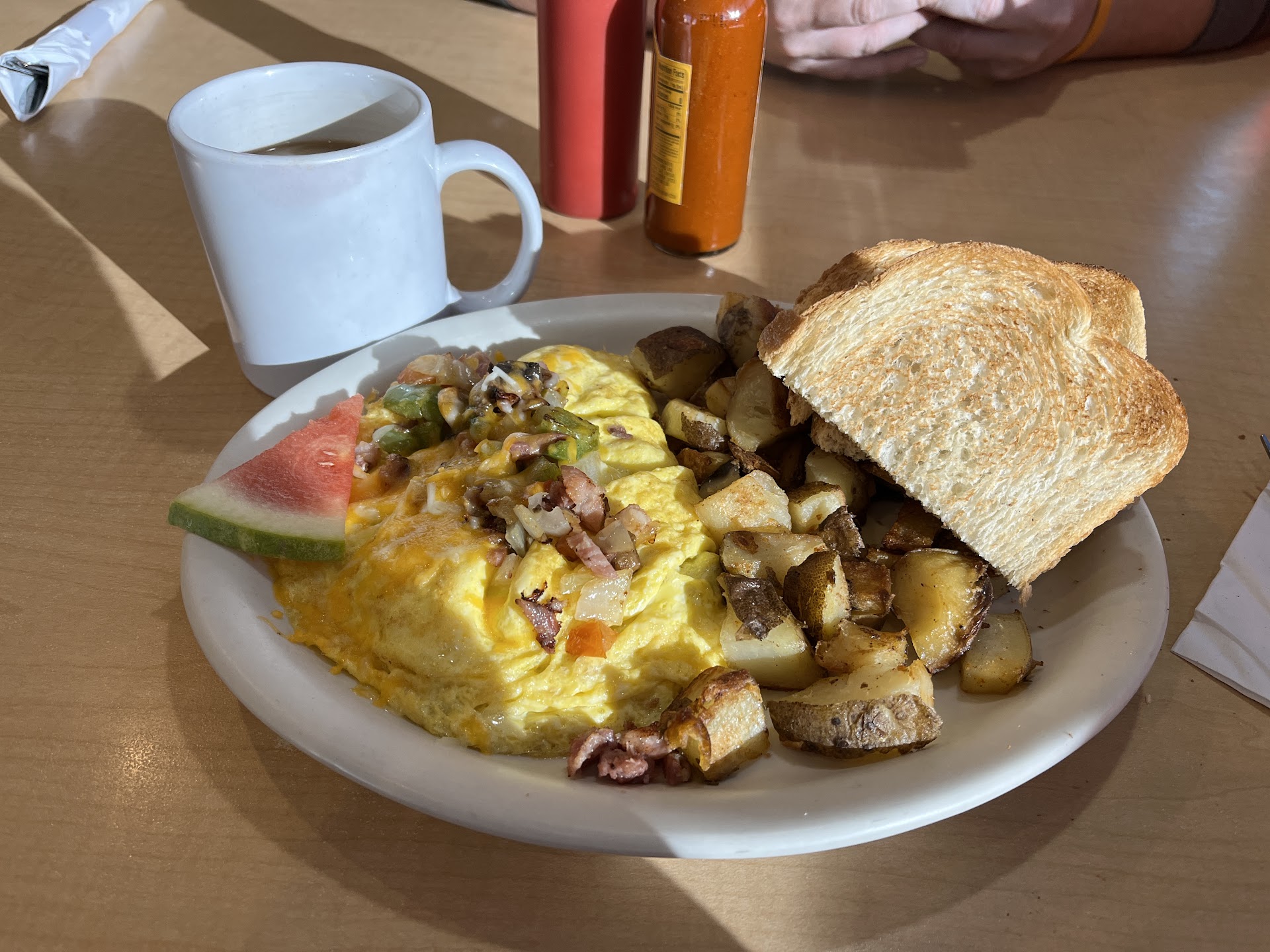 The second dish was a standout omelet, constructed with three eggs and generously filled with bacon, green chilies, and cheese. It was crowned with a fluffy biscuit and drenched in a rich, sausage gravy that was made from scratch, a testament to the cafe's commitment to quality. The biscuit and sausage were particularly noteworthy, possibly the best we have ever tasted.