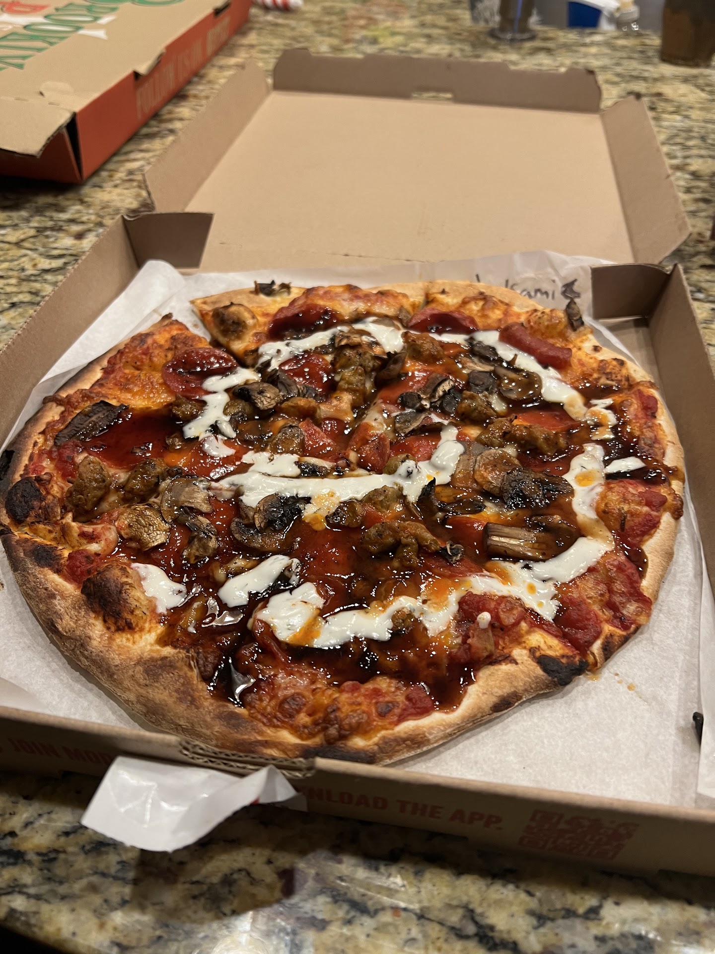 Read moreWhen we are at MOD and order, we love the pizza. Pick and delivery has been more of a challenge, but tonight topped it all. We ordered through Door Dash… it has limited options for requests. It has an option to add sauces and I thought it would be a great idea to try some of them. So, I received my pepperoni, sauce, mushroom pizza in a timely manner to find it was drenched in fig balsamic, buffalo sauce, and ranch. I was stupid to think that the person on the other side would not think that they should be on the side. My bad. That kind of thinking is a lot to ask of these days. It was so ridiculous that I did feel the need to call the MOD. I spoke w a very nice manager named Nathan. He was very understanding and tried to fix it in anyway he could. In the end, the staff is just doing things as they have been trained to them. So, in the end, MOD corporate and Door Dash need to get their act together.