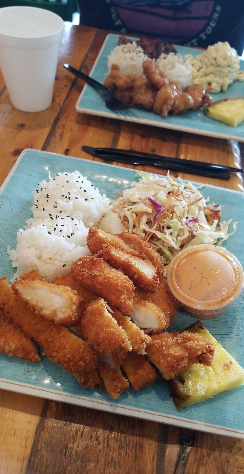 Read moreWow! I guess that I'm spoiled by L & L Hawaiian BBQ or maybe there was just no pride taken in my meal that I paid over $10.00 for. But I have never been so dissapointed ordering Hawaiian food ever. I ordered the 2 meat combo with 1 teryaki beef and 1 chicken katsu. As well as 1 spam musubi. Let's start off with the spam musubi. $3.00 for 1! The menu didn't say how many was to be included but coming from working and patronizing L & L Hawaiian BBQ I automatically assumed that it would be 2...especially for $3.00. But getting past the price the spam wasn't fried (which it usually is to bring out the flavor and slightly carmelize the meat) it was simply sliced and wrapped in what seemed to be regular white rice instead of jasmine or sticky rice. Anytime Ive ever had spam musubi in the past the rice has always had a very distinct smell inducative of sticky/jasmine rice. When I picked the musubi up and took a bite all of the rice started to fall out. #Dissapointed. Moving on to the macaroni salad it was flavorless and the portion was extremely small. It was also watery, and not thick. Again something that I'm used to having when ordering macaroni salad from a Hawaiian cuisine establishment. The chicken katsu on it's own was good but its sauce was very "Americanized" in that it was yellow instead of brown. It tasted like it just had ketchup, mayo, mustard and pepper. It wasn't very good. And finally the beef was extremely dry. It tasted like warm beef jerky with teryaki sauce poured over it. The meat was very tough and not tender which it should've been. Being as though it was so dry it seems like the food preparer either missed the marinating part or didn't bother to marinate it for longer than 10 minutes or so. If you're going to serve Hawaiian food then more pride should be taken in it's preparation., and...