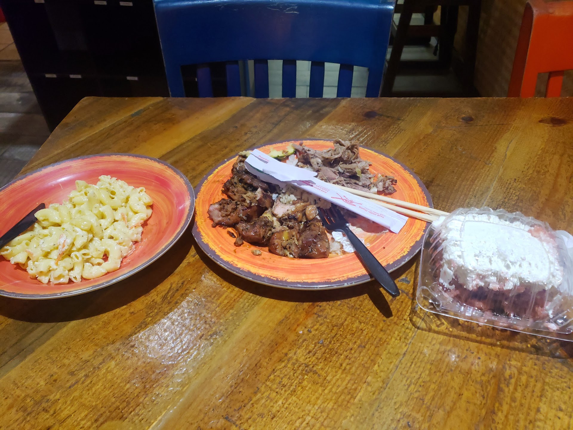 The atmosphere was great with real tapa cloth and some kitschy Hawaiian wooden decor typical of touristy Waikiki (very nicely done though). They had the right music with some J Boog playing on the speakers overhead. Even the presentation of the food was amazing. Unfortunately, if you've ever made Hawaiian Macaroni salad, you'd know that they didn't wait long enough for the noodles to cool before adding the mayo causing the oils to separate and you also can't create the perfectly scooped dome of noodles like this. Great addition of the black sesame seeds for decor but they also added a dash of salt on the rice?!?! Never once while living in Hawaii did anyone ever add salt or seasoning to scoop of "sticky" rice - that's up to the consumer. Also, the rice was more dry than the right blend of sticky so it fell apart easily with chopsticks. The Teriyaki chicken was lacking a good Teriyaki sauce and sadly not only had an aftertaste I couldn't place (not sure what brand they used but definitely not one I'd recommend), but you could taste the heavy char of the meat. The kalua pork wasn't too bad - a lot less salty than any of places locally but there was a heavier smoke flavor which is hard to tell if it was just because it was easier to taste without the salty punch. The guava cake should've been listed as a bread pudding because it was super soggy with too heavy cream. Honestly, I've never left left overs at a Hawaiian restaurant, especially when paying extra for macaroni salad or dessert, but this was not my favorite meal. I was really hopeful with their high rating but Aloha Kitchen (dang, even Ono's) is still way better and more authentic to the islands.