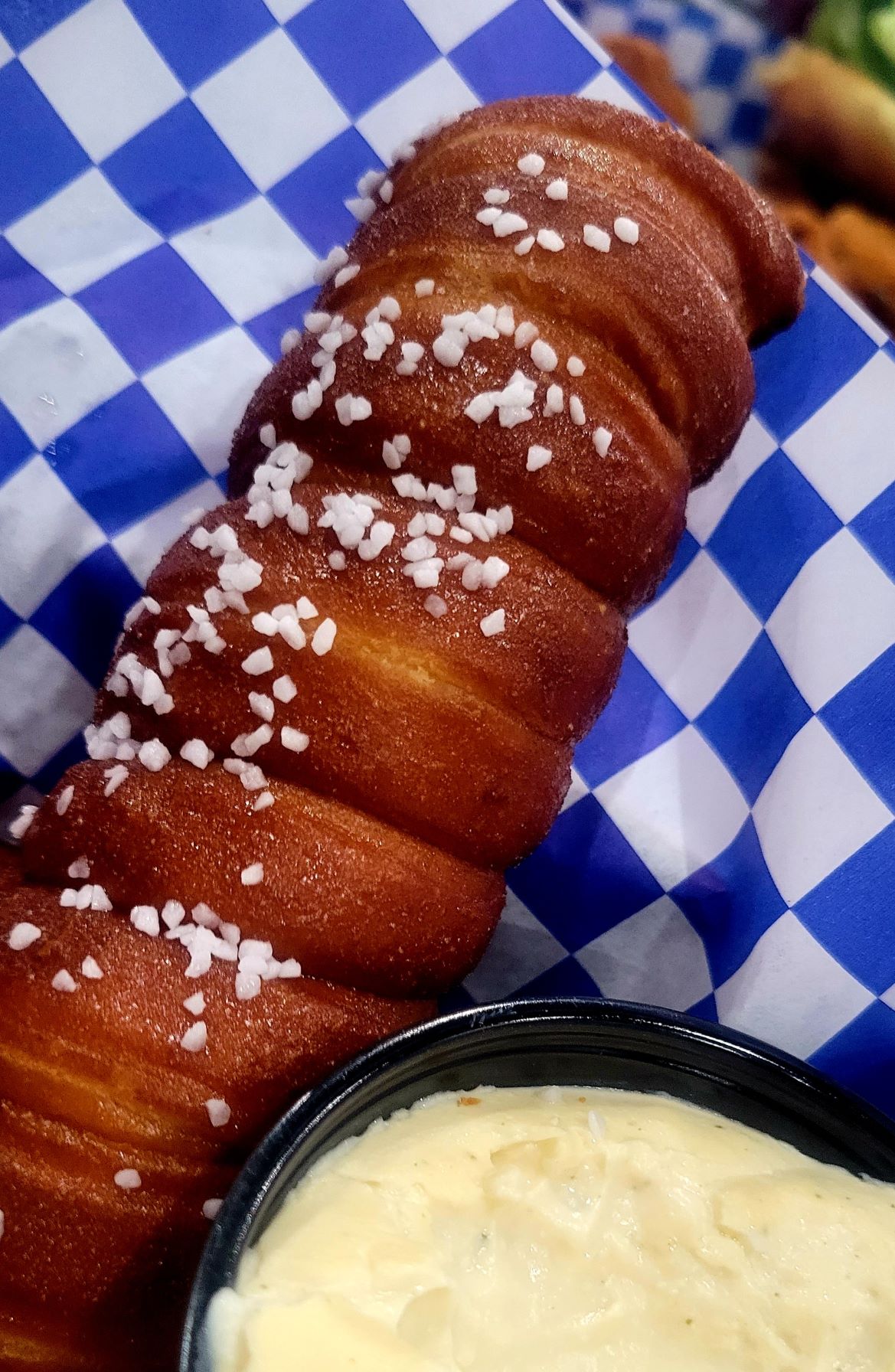 My dad ordered Chicken Tenders and fries. The chicken was overcooked and parts of it were rock hard. He said that it tasted like “chicken tenders”. My husband ordered the All-American Cheeseburger (added bacon), housemade chips and Fried Pickles. There are no pictures of the burger because it was pretty average. The housemade chips are phenomenal. The Fried Pickles were a tad over cooked and harder that we would have liked, but the batter and pickles are delicious, a little spicy. I ordered Pretzels & Beer Cheese and Cheese Curds. The Cheese Curds are probably the best ones that I have ever eaten! The pretzels were very large and tasty. The beer cheese was very, very good.