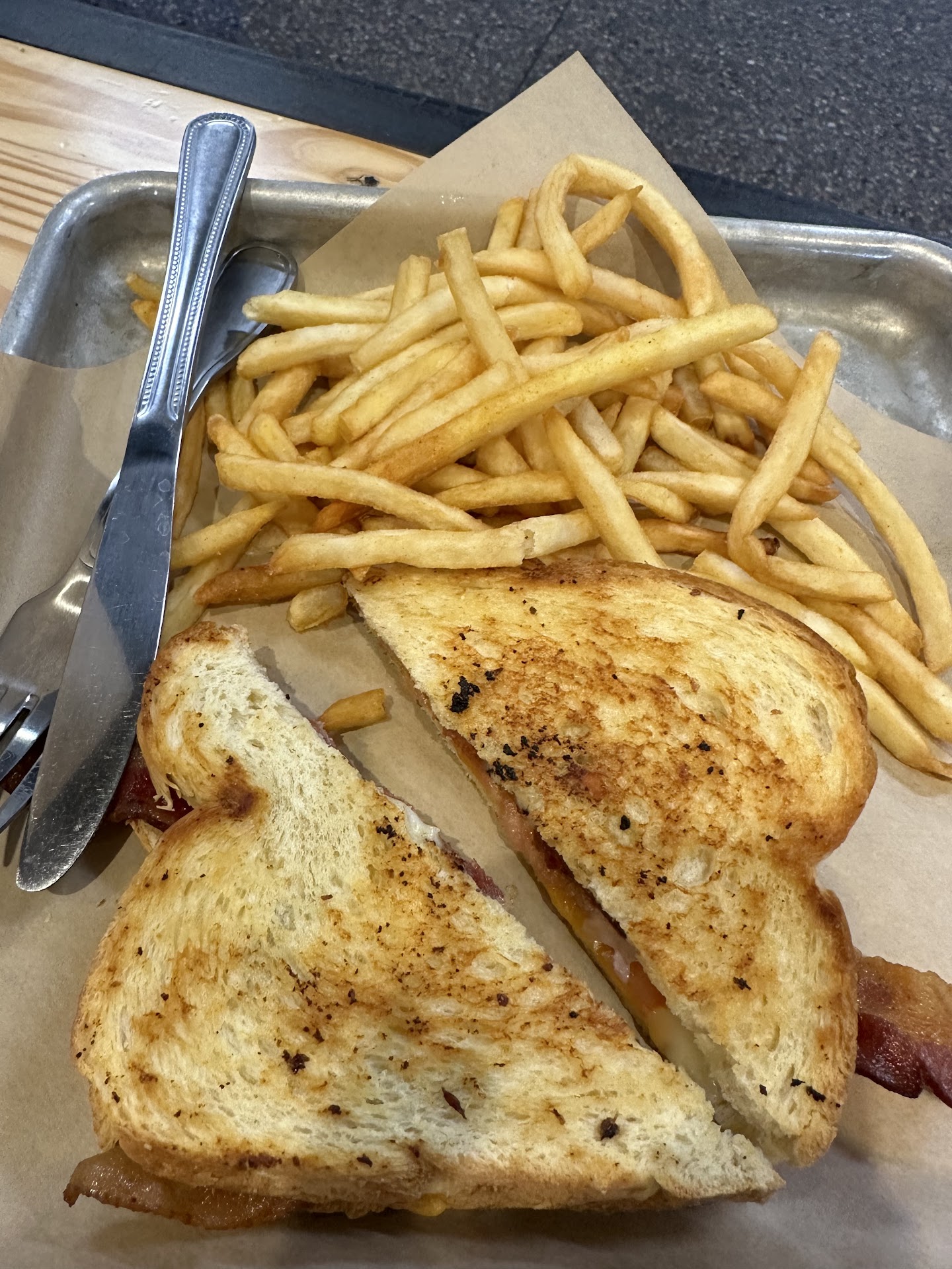 The menu is very limited but they have a Monte Cristo so I tried that. It came like a desert item with a flaky powdered sugar-coated croissant that was awesome but a little light on the filling and obvious half melted kraft cheese in the middle. They also give you a little jar of store bought jelly with no utensils to try to dig it out. At least put it in a container and pretend you made it? So I dipped my fries into some smuckers jelly because that's what you do in a fine dining establishment.