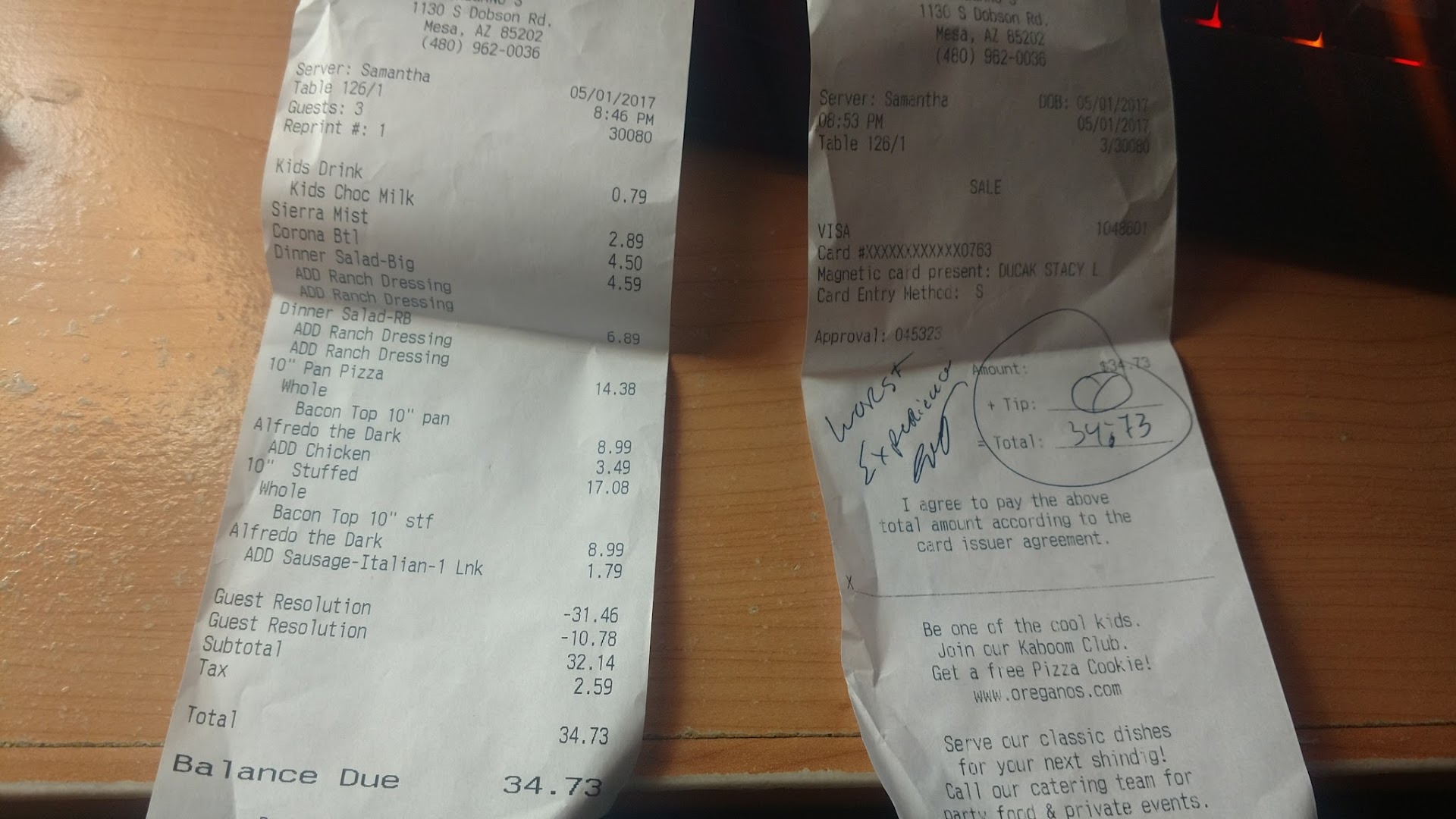 Read moreWe brought a party of 8 to a late lunch on a Saturday. 230pm. I had called 5 minutes before and was told there was no wait. When we arrived we were told there was a 30-40 minute wait, which I questioned because the restaurant was only 1/2 full. We waited and watched party after party arrive and be seated promptly including 2 large parties of 6+ people. After 35 minutes I complained to the general manager who raised her voice to me and told me my 40 minutes wasn't up yet. I took a picture of the dining room (half full) We were finally seated after 50 minutes. Then our 3 pizza's arrived cold. My salad had 2 lettuce butts in it and was brown and slimy. My wings arrived right before our dessert, so I had to request a to go box and not eat them at all. Plus, we never got any refills on drinks after asking twice. The Manager was very stern with me at the end of the meal for causing problems for her with the large party since this was only her 3 week managing. I pointed out 2 other parties that were larger than ours. I also pointed out the cold pizzas and slimy salad and late wings. She didn't even apologize. She took the salad off our bill since I sent it back to the kitchen. I contacted corporate Oreganos and offered names, pictures and statements from the other adults in our party. They sent me a one line apology email, never addressing any of our concerns with the wait with a half empty dining room and cold and slimy/brown and late food. We spent $200 at Oreganos that day. We have eaten at Oreganos for years. And taken many out of town guests there for dinner and lunches. They used to be the best! But, NEVER AGAIN! Especially since Corporate didn't even care. How can you not care that your food is coming out cold and brown and slimy? Not to mention the lies their new General Manager told and yelled at us. Obviously other people have had the same experience that we had. They used to be packed no matter what time of day you went to Oreganos. I pass by there everyday driving my kids home from school and no one is ever there. If you want cold expensive pizza and brown slimy salads Oreganos is the place to go. Just a shame. They used...