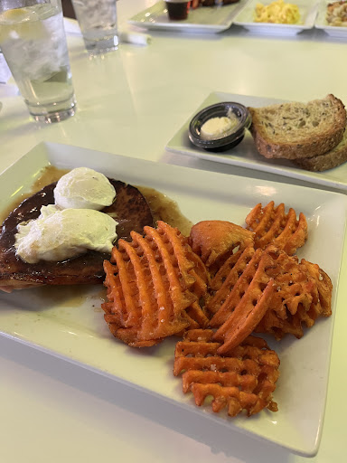 Read moreI absolutely hate to give three stars when I want to give five. Let me tell you how much the corn dogs or pancakes on a stick were my absolute favorite! I told the waitress how impressed I was with the quality of that particular item. She was very happy and so delighted to hear that. She asked me if I could please share my experience and give a review on Google. With that being said, I am going to be honest because this place has potential. I want to bring my whole family next time so they can order the corn dogs. I ordered the ham and eggs with sweet potato waffle fries and toast. I LOVE waffle fries ,especially, sweet potato fries. That was the first thing I bit into when our server bought us our food. First thing I noticed, It wasnât cooked all the way through so my bite was not a crunch it was raw. The outside was fried but not enough to give it that nice crunch. The second thing â my toast was already cooled and the butter was in a little container on the side. I put cold butter on toast that wouldnât melt, which is not very tasty when you are having ham and eggs. I ate the toast ( super delicious bread ) and ate all around the fries but left the ones that were too raw towards the middle. My husband ordered the corn dogs and asked me if I wanted to try them. LOVED THEM !! They donât come with anything other than the container of syrup so eggs and potatoes were added to make it a little more filling. His plate was very good. My eggs were good as well and my ham was very good.