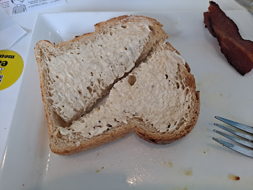 Wife and I stopped in for breakfast this week. I ordered two eggs over medium meal. It included two eggs, toast, hash browns, and a drink, maybe coffee or something. When my meal came, I could taste the grease off the grill on the hash browns. I'm really disappointed. The eggs, there were two small, medium-sized eggs, not the great double-A large eggs. I was disappointed that I didn't see a significant egg on my plate, and the toast. When the toast came, well, it was part of the meal, I expected two pieces of regular bread, but no, they didn't. They gave me one piece of bread. You know, it looked like it had been a special kind of bread. I'm trying to remember what it was, rye? It's about the size of one, about three quarters the size of one slice of regular bread, To go with that bread, they had chosen the jelly that I was going to put on my bread. There wasn't a selection at the table. They didn't bring a selection out. What they did is they filled up a little ketchup cup with, I don't know, something from the back room, and that's what I got - that was my jelly, there was no choice, that was the jelly I got. My wife asked for her bacon to be extra crispy with her meal, but it came out and it wasn't extra crispy at all. She gave me one of her pieces of bacon and I could smell it. It smelled funny when it got close to my nose and I don't know what it was. Was it the cure in the bacon or smoke flavor or something? There's something weird about that bacon. So, it certainly wasn't crispy. And finally, the coffee was nearly too bitter to drink. And they would come by and keep my cup full. You know, I had good service. The lady would come and, you know, top it off, that kind of thing. But it was terrible coffee. It was like that, like some cheap bitter stuff. We learned our lesson with this breakfast restaurant. Maybe they were in cost cutting mode.....1 small slice of bread, medium sized eggs, jelly probably from a large container in the kitchen, burnt bitter...