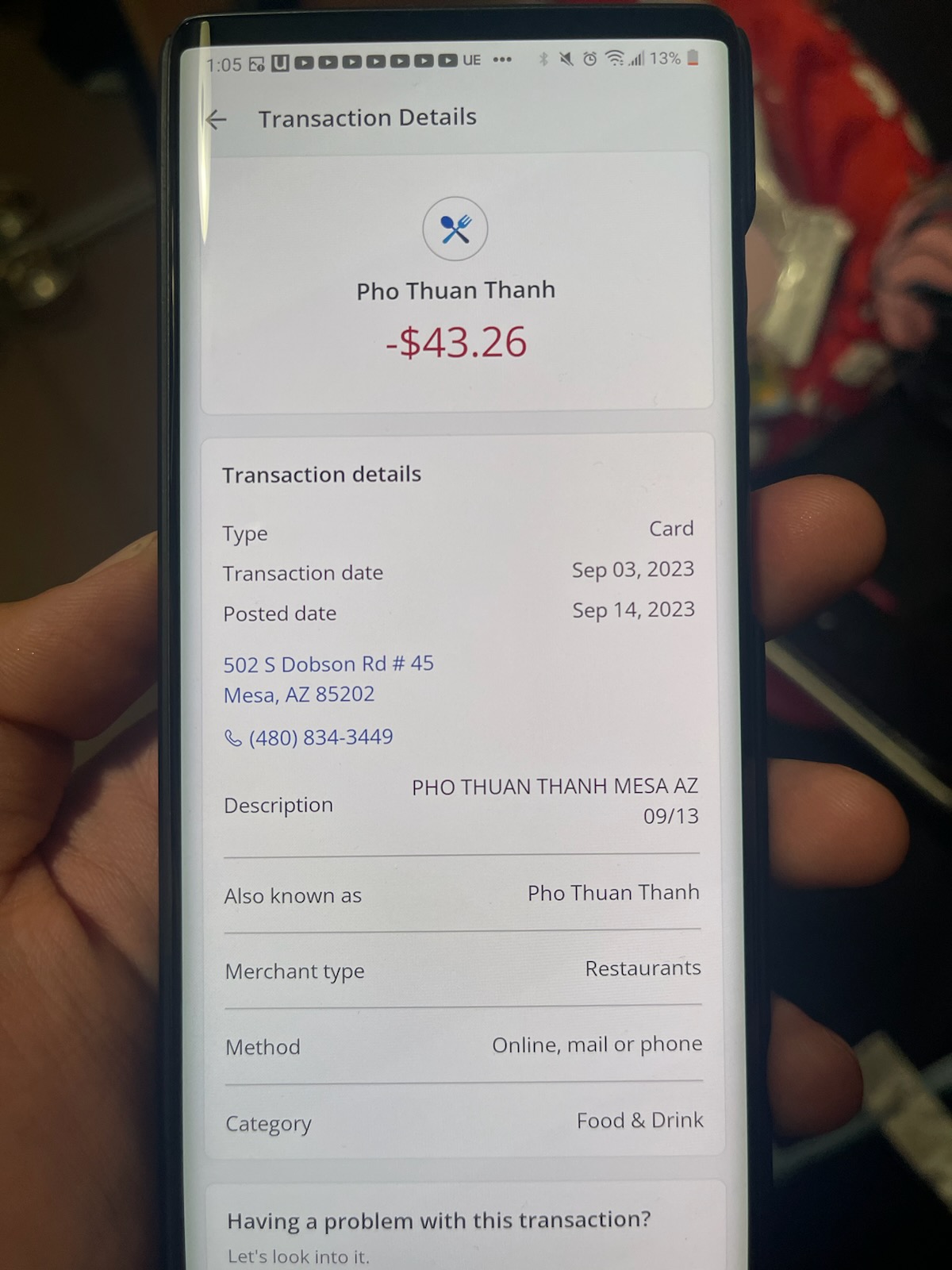 This place uses an old machine and pen and paper order taking so the order they claimed was ours, was taken the same day we went there, but had items we never ordered. I remember it had a dry vermicelli noodle dish and the grape leaf rice paper dish, vietnamese pickled soda drink and another specialty drink. If you calculate everything I ordered that day plus tax it comes to 43 something, not the 50 something they claimed I ran out on. I tried to check my bank account on my phone but their system takes a long time to actually show up on the card statement. So I couldnt show it to them that I did pay, I didnt have my reciept with me, most people wouldn't keep a week old food reciept either way. I tried to explain to her that it wasnt us, that we only ordered waters and never those vietnamese drinks and named the exact dishes I ordered but she still was saying it was us. We have been customers for years, our orders ALWAYS included a pho. All the hand written order reciept had was the name of the food and the date. The only same thing between me and the actual thief had was that they both had the grape leaf rice paper dish ordered and it was purchased the same day I visited which was september 3rd. Maybe I look like the same people? Even if I did, they did not even ask me if I maybe forgot to pay last time, instead they try to force it onto my bill and make us pay it.