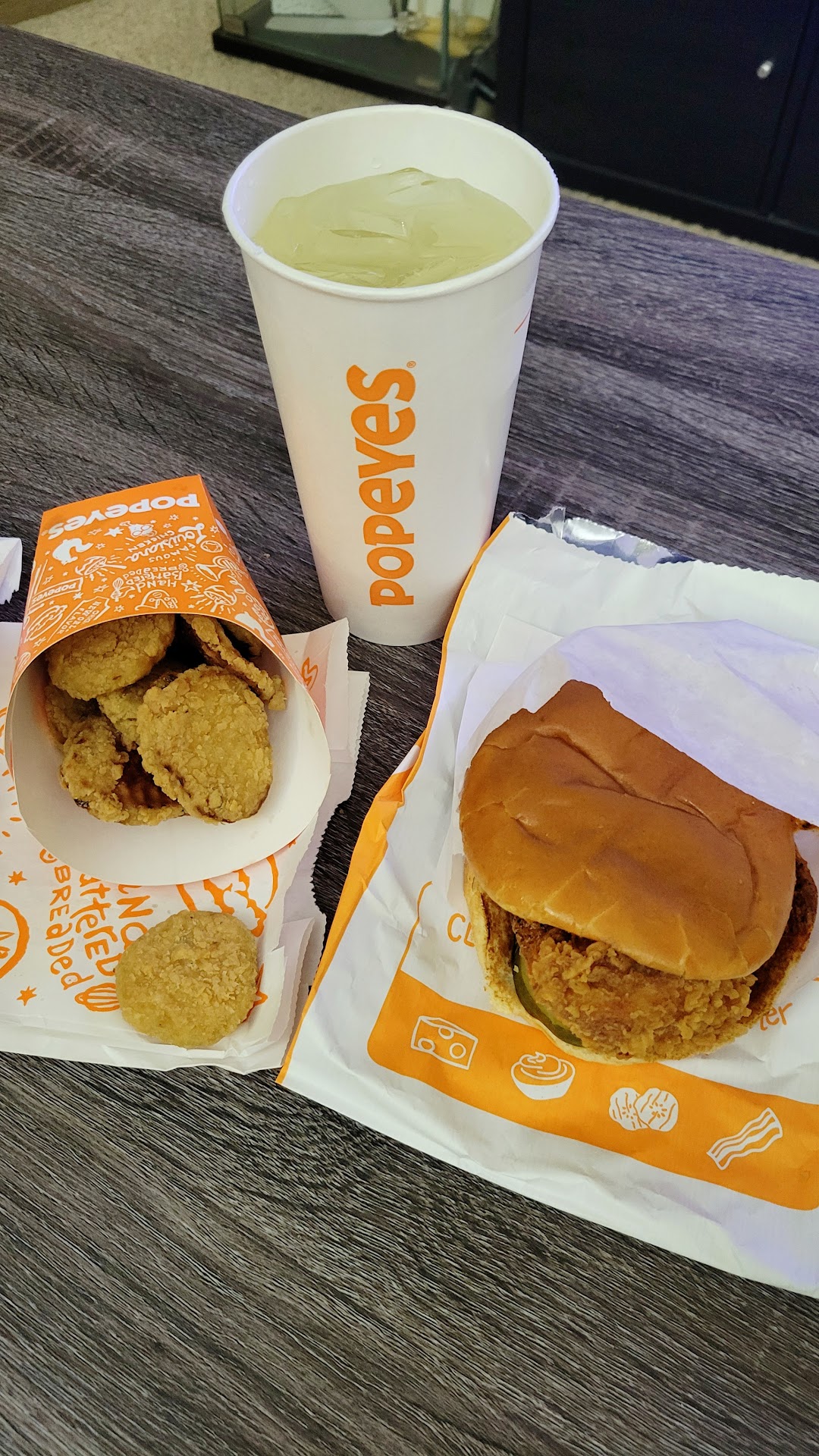 I got the Pickle Glaze Sandwich, Fried Pickles, and a Pickle Lemonade. The pickle glazed sandwich was kind of disappointing. The glaze was only on a quarter of the sandwich and it was near the bottom. While the chicken sandwich tasted great, I wouldn't say it was overwhelmingly pickle-y. I couldn't distinguish the difference between the pickle glaze sandwich and their normal chicken sandwich. The fried pickles were a delight. I dipped them with some ranch I had at home (I bet it would have been better with their Popeyes' blackened ranch). As for the pickle lemonade, the thing I was most excited for, it was a let down. It ended up tasting like the brine of butter pickles to me. While I looove a dill pickle, butter pickles are not my jam but I get it. The sweet butter pickles and a sweet lemonade compliments each other more. For me, this was a pass. I actually felt a little queasy towards the end of my drink and I'm someone who drinks pickle brine...