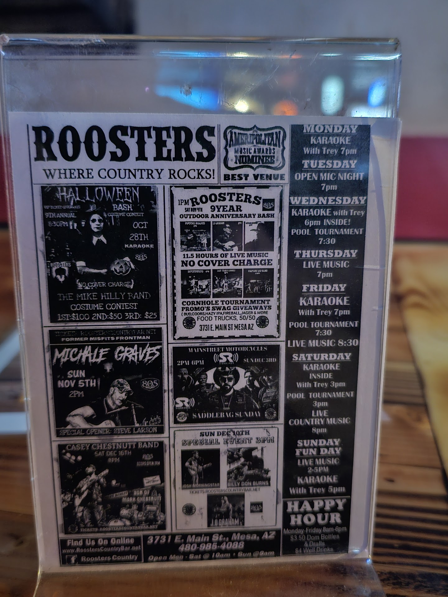 Read moreThe best thing about Roosters is the fact that they had a food truck outside. Bought tickets through their website to see a band play. Paid ~$75 for four people, general admission, "Doors open at 7pm". Arrived before 7pm and we were informed, "It is standing room only, all the tables are reserved." What????? We ordered a round of beers, in which we were overlooked by 3 bartenders who helped 5 or 6 others before us. Took about 15 minutes to get the drinks, and I was standing right up to the bar. Asked if there were ANY seats for the two disabled individuals in our party, and the owner (or the owner's wife) again informed us that all tables were reserved, that we could go outside to the smoking section, or get our money back. "People call us after they order their tickets to reserve tables, for $100". So very clearly, false advertising when the website lists general admission with no option or notification that there is reserved seating. I really wanted to like this place and have a good time, but with no seats and no ADA accommodations, there wasn't a chance. ...