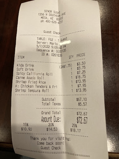 This is the worst sushi restaurant I have ever been to! The customer service is horrible and the worst part is the whole ambiance there is just not it! The staff is completely rude and don’t even bother to come around to ask if you need anything and when you do need anything it’s hard to find someone to actually tend to your request. The whole staff just sits around talking in the corners of the restaurant with no care in the world when there are people that I seen needing the service! They don’t tell you but make sure you actually look at the natural sushi’s and ask if they are a whole roll or half I paid more than I would anywhere else for half a sushi that was not worth the price. I had never came here I’ve gone to other sushi restaurants far better than this one! I was not aware that the only whole sushi’s they sell are the fried sushi’s. Overall the experience was the worst if I could rate it a zero I would! Think about coming here before you actually enter this establishment. The waiter ‘Mario’ was the worst! Upon asking for condiments and service he gave a really horrible attitude and judged your character when you ordered or asked for anything else. Im not sure why someone who chooses to act this way with the public continues working there. The other waitresses I didn’t get their names for are super rude as well and don’t care. They complete ignore you! I’d be better off getting up to get my own utentsils, drinks and orders at this point! They will never come to refill your drink running empty nor cater to your table upon requests! Even if you were to ask them to give you anything else they give you the crappiest attitude ever! This is by far one of the worst restaurants I’ve been to in Arizona! I will never be coming here again! Thank you for the worst customer service!!! There you have it folks, think about whether you want to really come here it really isnt worth it! No wonder the restaurant was empty on a weekend night! Sushi Sonora has better customer service and tastes way better and the prices on their rolls are the best, unlike Señor Sushi, Sushi Sonora actually provides whole rolls on all their sushi’s!!! Sushi Sonora also don’t be judging what you order nor throw tantrums when you order more off the menu! I really hope they check that ‘Mario’ he really is a nasty one to deal with as a server/waiter at this restaurant! I can say the tips were not deserved at...