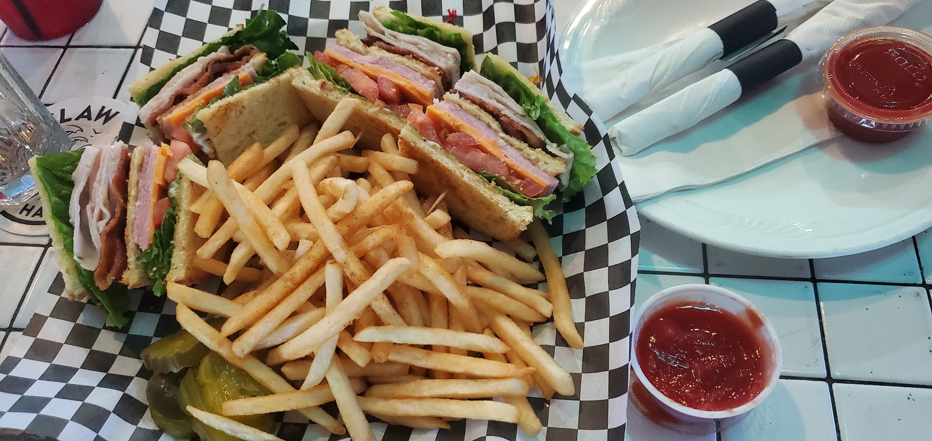 The menu has changed a little bit since we were last there. Yesterday, my daughter and I stopped by for a late lunch. I had the French dip and it was so delicious...the toasted roll, the meat, and the au jus were a perfect blend. The waitress AND the cook, who came to our table at least three times, told us the meat was prepared on-site and the au jus was directly from the meat drippings...I'm telling you, it was delicious. My side salad was FRESH GREEN lettuce (I am so OVER white iceberg lettuce...enough already!), crunchy cucumber, crisp tomato, and ranch dressing...perfect size. My daughter had one of the specialty burgers (the one with bang bang sauce?) and said it was the best burger she'd had in a very long time. Her fries had just the right amount of seasoning and were the perfect balance of soft inside and crispy outside. The cook (should I be calling him a chef? What's the difference between a cook and a chef?) tempted us with his homemade cheesecake with raspberry sauce (we could have opted for caramel sauce) and chocolate ganache (is that redundance? Seriously, I am NOT a cook...OR a chef) cake. I'm typically a chocolate girl, but daughter and I were making brownies later, so we split a piece of cheesecake. Oh. Em Gee. Do it.
