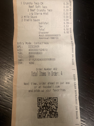 Read moreI made the mistake of trying to redeem a reward at this Taco Bell. Taco Bell's reward program through the mobile app is a bad joke. I've been trying to get it to work in different cities around Arizona since last fall. The rewards don't come through. One place in Prescott told me that it can take up to 30 minutes for it to come through. I finally gave up for a while. But I thought I'd give it another try tonight. My mistake! I ordered ahead of time and I went to the Taco Bell to pick it up. Sure enough the order hadn't come through. They said if I wanted to pull around and wait in the parking lot then they would do it when the order came through. If I wanted to wait I wouldn't have ordered it online! And the young woman at the window really didn't care. ou could tell she wasn't used to doing any critical thinking. She certainly wasn't going to be a problem solver. I told her to forget it and left. I deleted my rewards. I went online to Taco Bell to try and let them know what was going on. I went through the whole process and at the end of it instead of submitting my comments, the only option I was given was to start an order! Unbelievable!...