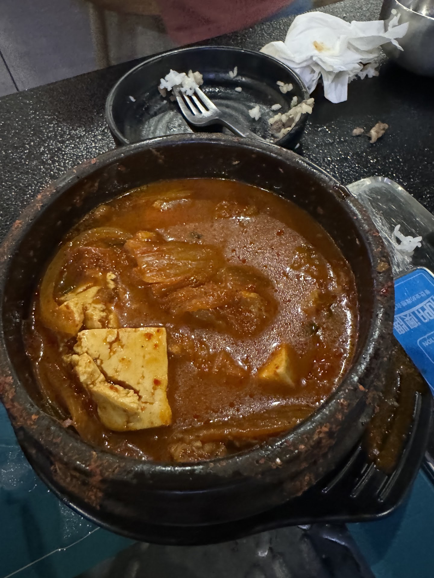 The problem was the kimchi chigae. It was NOT good and the worst I’ve ever had. It had such a sour, bitter taste, was extremely dark in color, and the pork was so mushy. It just tasted off, smelled and looked off. My mom and I took one bite each and could not eat more. We asked the waitress and she tried the soup and said it was a little salty (probably due to more done kimchi) but tasted like it normally does. We told her maybe the off taste was radish in there and she said they don’t put radish in it. Well we took a spoonful and showed it to her and she said “oh”. We asked if there was any way they could take it back and not charge us since we didn’t have hardly any of it and it tasted off. She came back and told us she couldn’t. To me- that’s just not a good business practice. We weren’t asking to get meat or anything more expensive taken off, just the inedible $15 soup that she admitted was very salty and shouldn’t have had radish in it.