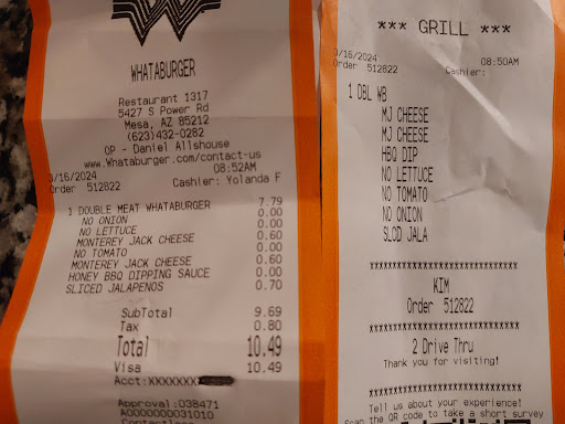 I came to this location on Power to buy my husband a burger after he had worked a 21 hr shift. All he wanted was a whataburger, exactly as presented in the receipt and "grill" slip. He specifically asked me to request to add "cheese, BBQ sauce, and jalapeño", the rest is because I know how he likes his burgers.